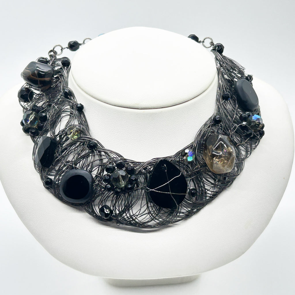 Make your presence known with this handcrafted midnight black gothic style statement necklace,  equal parts edgy and elegant. Featuring a sculptural wire mesh collar adorned with moody black and gray stones—think agate and jet—this avant-garde beauty practically beams with artistic flair. The organic wirework creates a striking 1" to 1.25" wide collar that sits like wearable art, while silver-toned accents and a lobster clasp keep things polished and adjustable. The stones are woven into the necklace with the help of thin wires- as seen easily in the center stone.  It measures an adjustable 17" long, and can be adjusted to be worn shorted. It has a secure lobster clasp. This handmade choker is perfect for channeling gothic glamour at special events or simply making everyday moments feel a little more dramatic and daring.