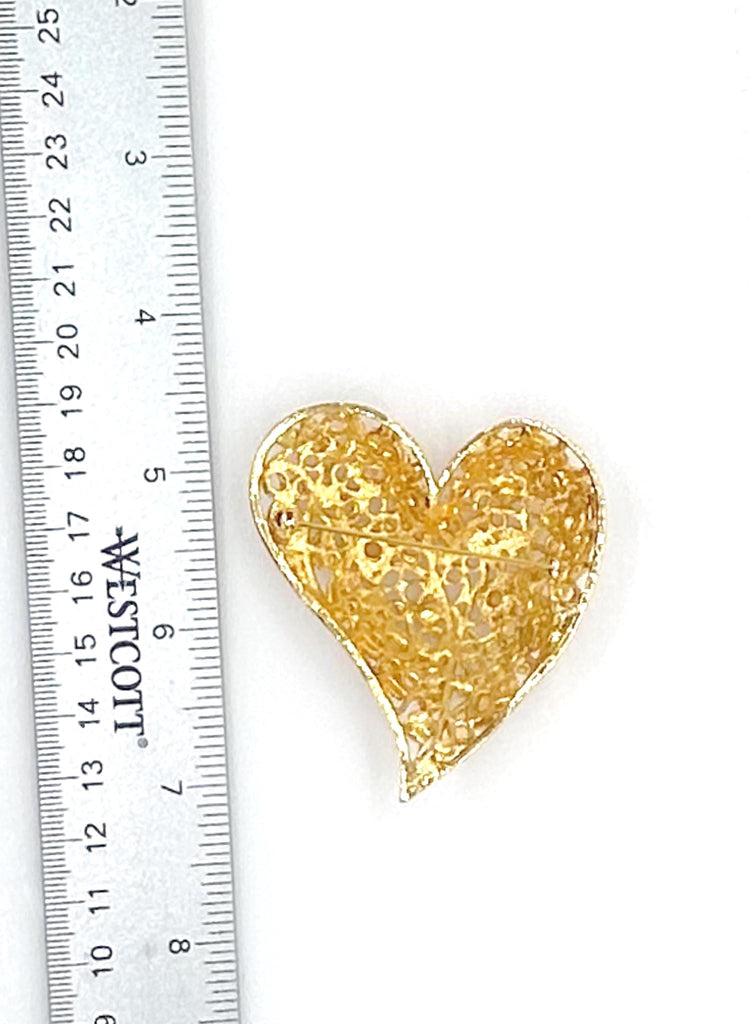 A refined vintage heart brooch that exemplifies mid-century craftsmanship at its finest. The intricate filigree detailing frames an elegant composition of faux pearls in varied forms, while delicate rhinestone accents provide understated luminosity. Measuring 2.5" by 2" at its broadest dimensions, this piece strikes an ideal balance between presence and restraint. Preserved in exceptional condition, it represents the kind of thoughtfully designed accessory that elevates any ensemble with quiet sophistication and timeless appeal.