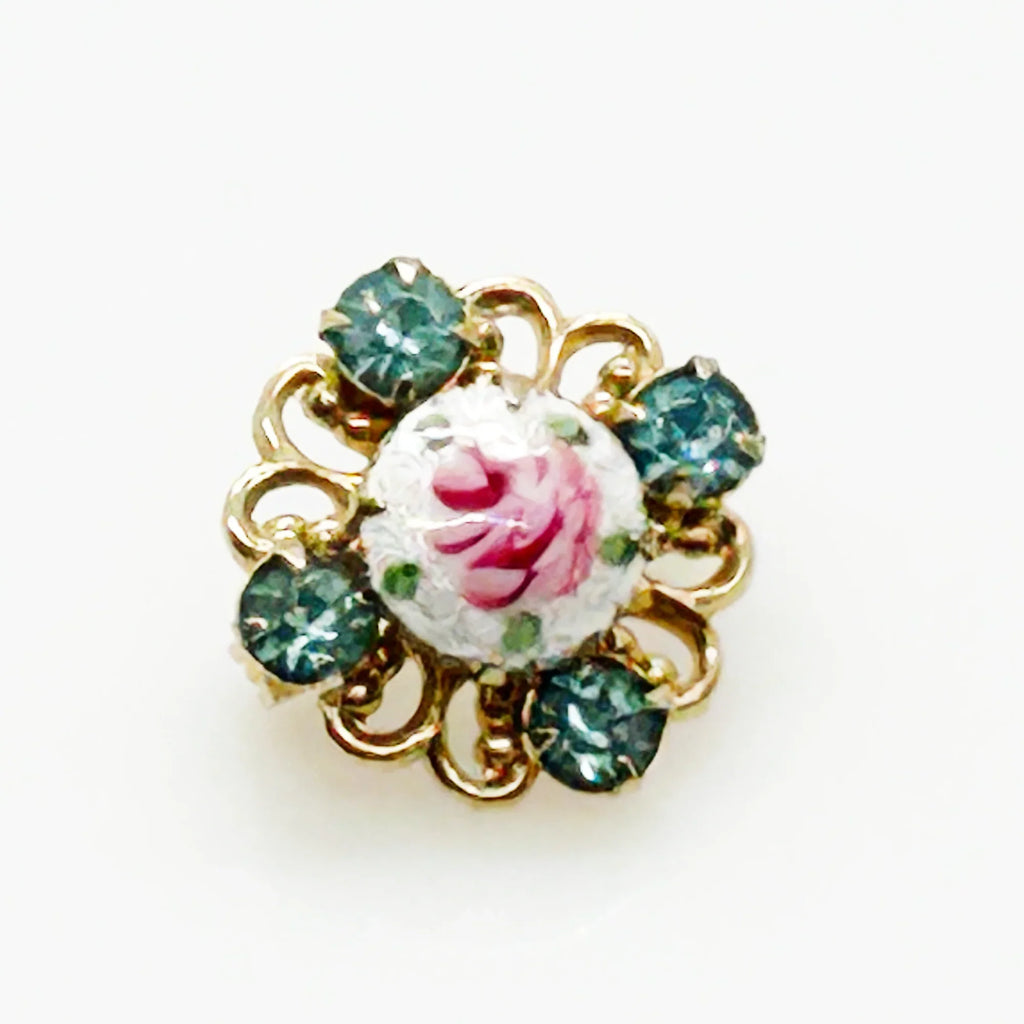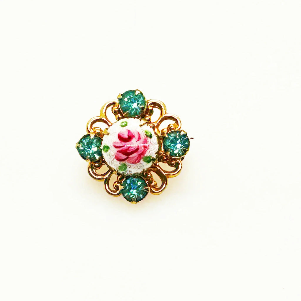 Take a closer look at this vintage gold-tone guilloche enamel rose scatter pin with blue rhinestones. The pin features a hand-painted pink rose on a white enamel center, surrounded by four aqua/turquoise blue glass rhinestones. It has a gold-tone metal base with pretty scroll work and a roll-over clasp. These types of pins were popular in the mid-20th century. It measures a sweet 1/2" across. The back shows lovely metalwork.