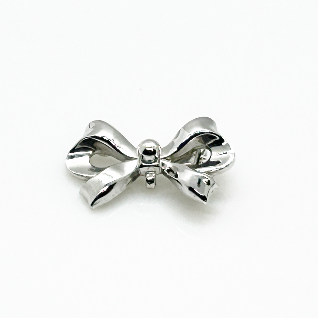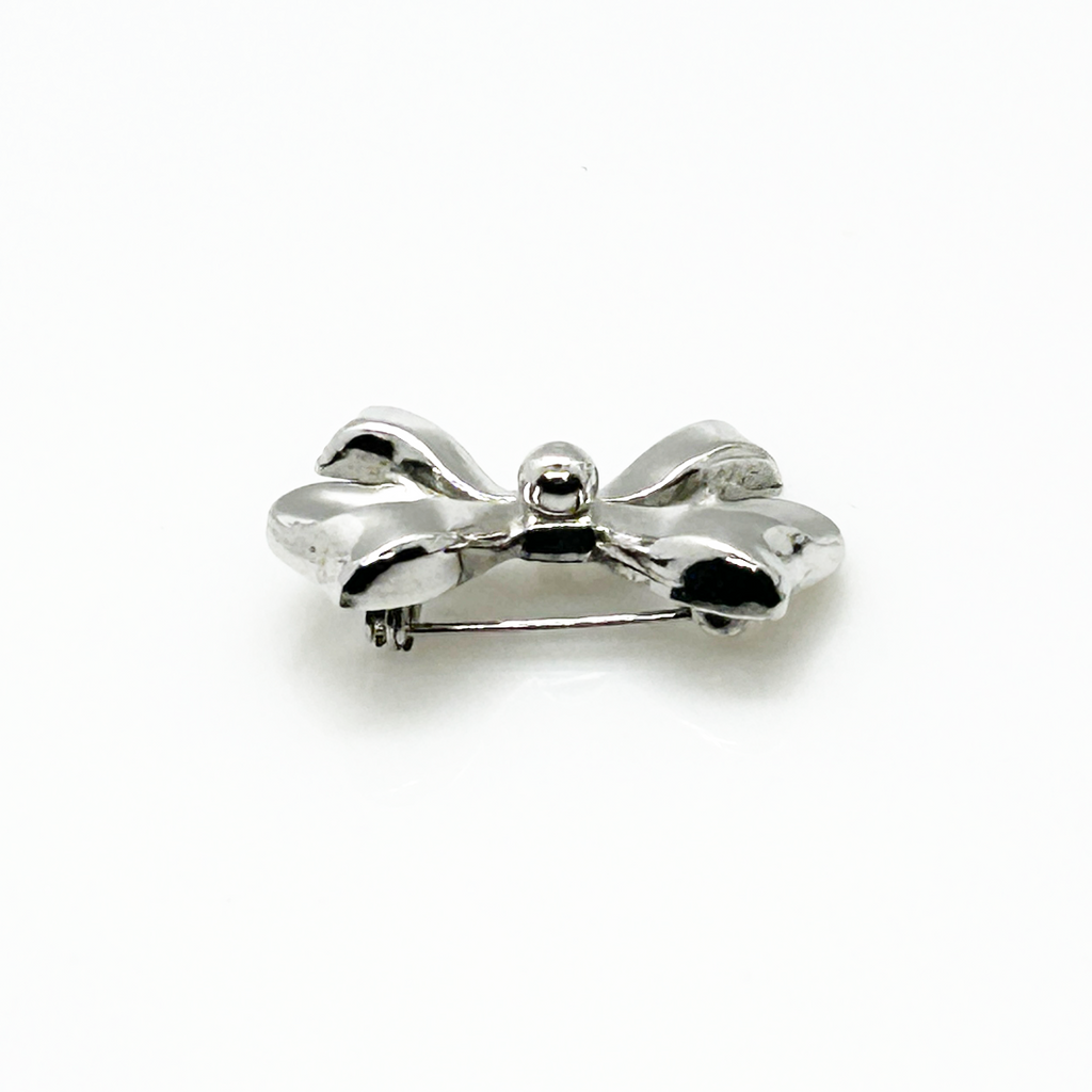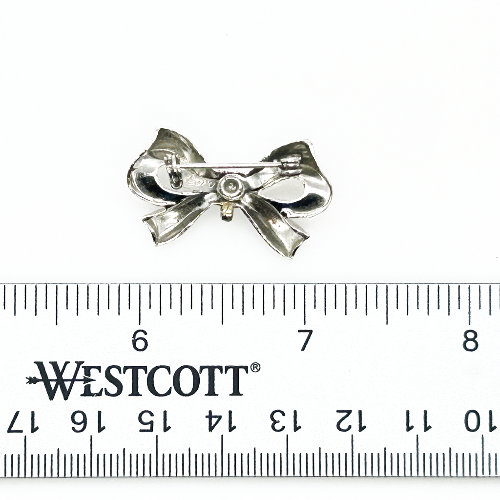 Add the perfect piece to your vintage jewelry collection with this charming Coro bow pin from the golden age of costume jewelry. Crafted with a polished, gleaming finish, this petite accessory captures the elegance of mid-century style with its delicate tied-ribbon design. Dating to the 1940s-1950s era, it measures just 1.25 inches across and bears the authentic Coro maker's mark on the back. A versatile piece that adds a touch of nostalgic sophistication to any outfit.