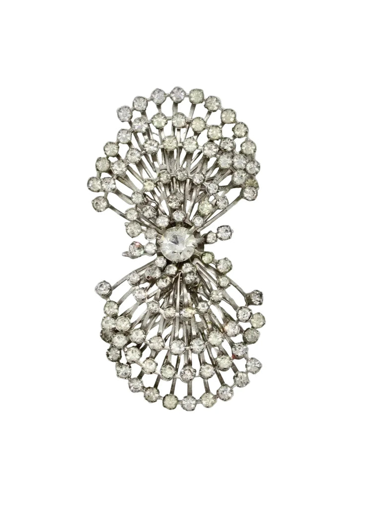 Here is a detailed description of this captivating vintage pin: This truly unusual and abstract vintage pin features a stunning array of round rhinestones elegantly set in a silvertone base. Measuring approximately 3" in length, this piece demonstrates exceptional craftsmanship and is preserved in very good to excellent condition, showcasing its enduring beauty. The clever layering of the design elements enhances the brilliance, allowing the rhinestones to beautifully catch and reflect the light, making this pin a true statement piece.