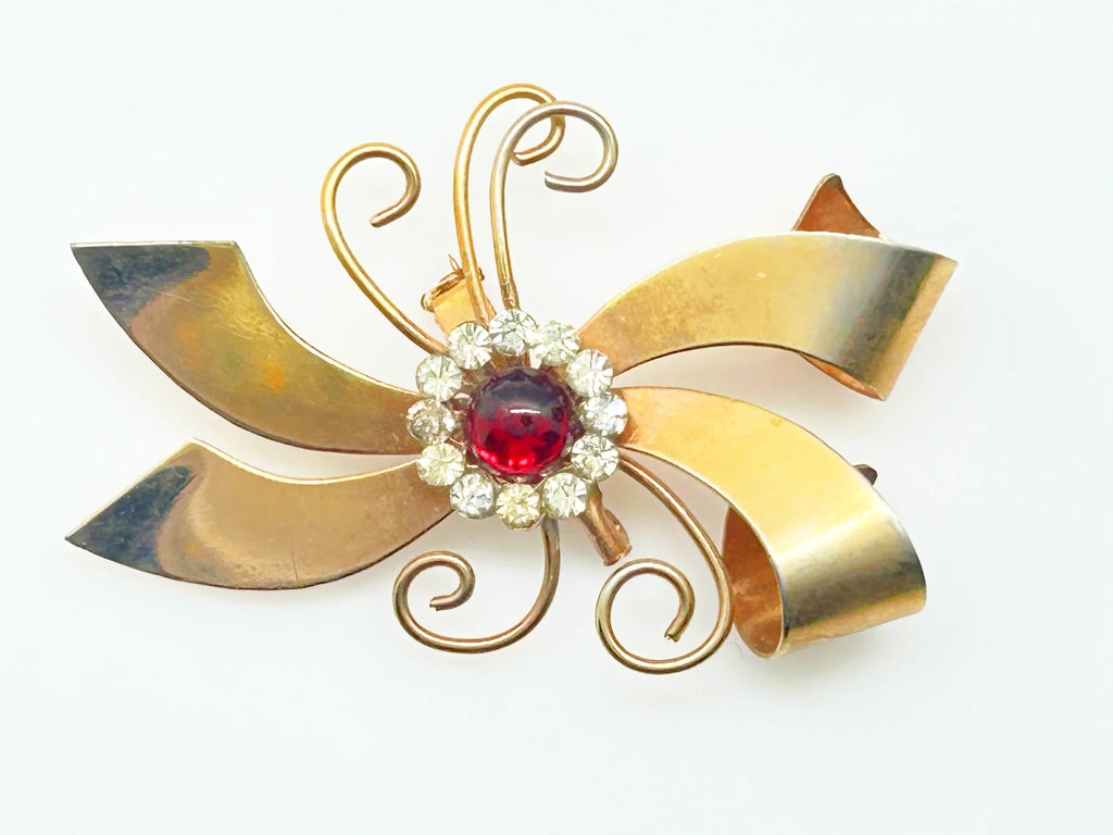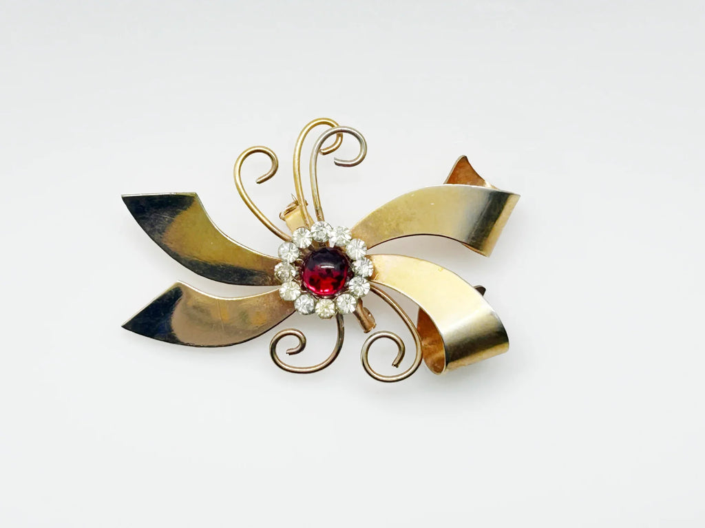 Vintage Abstract Bow Brooch with Red Cabochon and Bright Rhinestones
