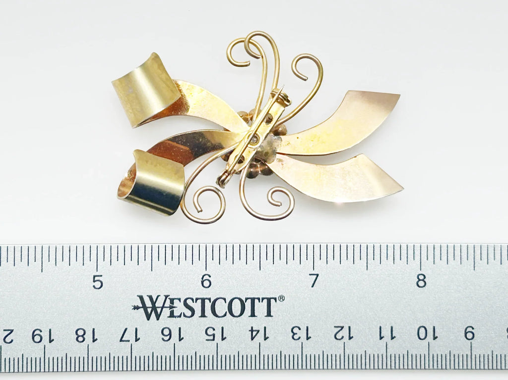 Dress up your look with a touch of vintage chic! The charming bow brooch, adorned with a round cabochon and vibrant rhinestones, adds a playful and unique flair to any outfit. Embrace its character and make a bold statement with this 2.75" accessory. Don't be afraid of the slight wear and tear - it only adds to its vintage charm. Elevate your style with this must-have accent piece!