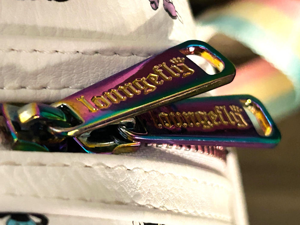 - There are two side slot pockets, measuring 4" deep, 4.75" wide, and a main compartment with a pastel ombre zipper and matching zipper pulls reading "Loungefly" in the distinctive Loungefly lettering.