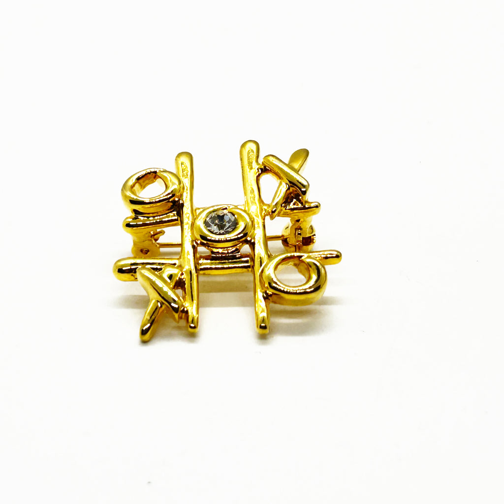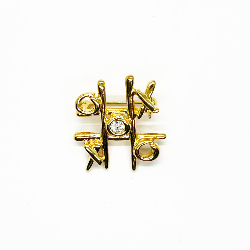 This charming and sleek Anne Klein brooch captures the playful spirit of vintage costume jewelry with its clever tic-tac-toe design. Crafted in warm gold tone, the piece features an open-style board complete with X's and O's, crowned by a sparkling clear rhinestone at its center.