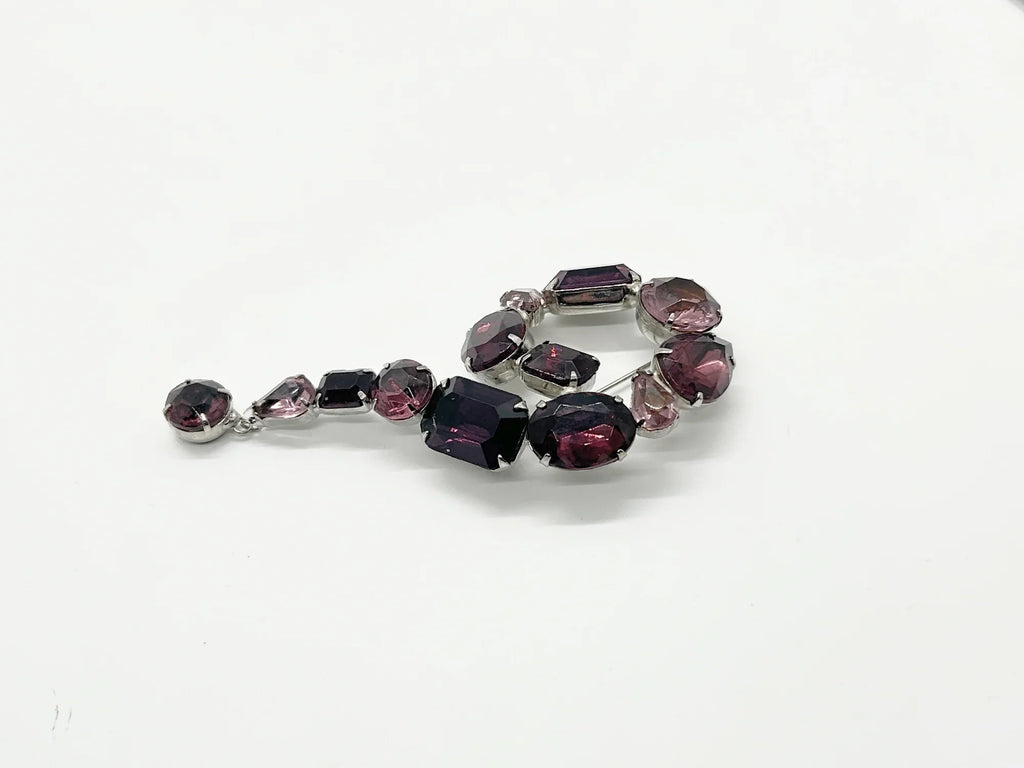 Get ready for all eyes to be on you with this Vintage 4" Purple Question Mark Brooch. From the 1930s, it features varying shades of purple, lavender, and amethyst. This brooch is a true statement piece. The silver tone metal sets off the unique shapes, each prong set for added dimension. And the final touch? A large round purple drop that adds a perfect finishing touch to the already stunning brooch. You'll be the envy of everyone with this quirky and eye-catching accessory. It measures 4" including drop, and 2" at the widest point. Excellent vintage condition, too. Free Shipping