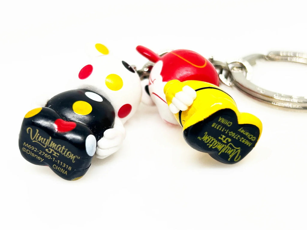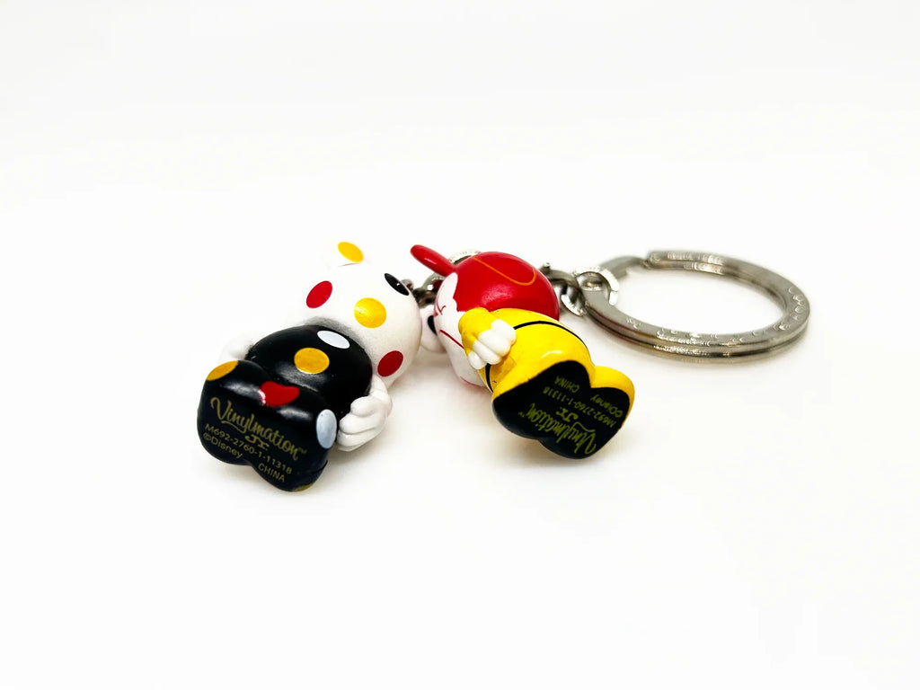 These keychains (or can be used as a purse charm) are part of a collectible series from Disney, featuring various characters and designs in a stylized, vinyl-figure format. Each figure measures 1.5" tall, and the keychain itself measures 1.25" in diameter and has "vinylmation tm" in uppercase letters. On the soles of the figures' feet, you can see Vinylmation Jr., m692-2760-1-11318, Disney, China.