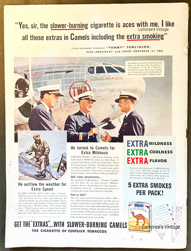 Many excellent ads including back cover with space pioneer "Tommy" Tomlinson; 124 pages; Small mailing label on back cover, some damage on right side of front cover, see photo. Ads include: Boxco milk amplifier ad, Pan American coffee producers ad with art by J. C. Leyendecker; DeSoto car ad with red convertible, Pennsylvania Railroad, Pall Mall cigarettes ad with art by John Falter and Camel cigarette and with "Tommy" Tomlinson.