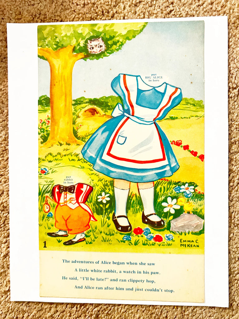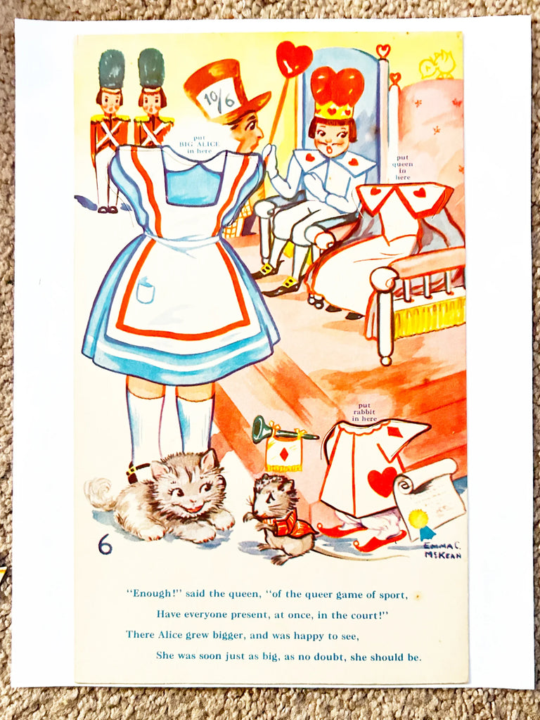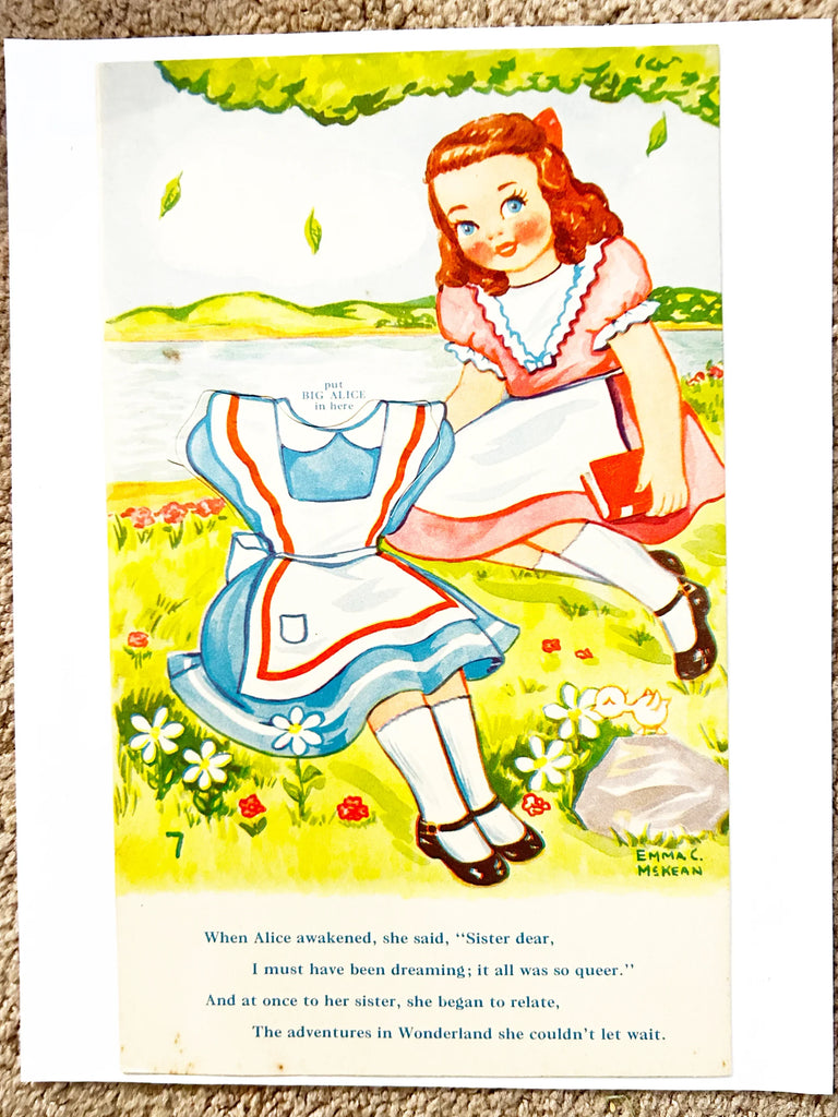 This is a vintage boxed set of "Animated Alice in Wonderland Dolls" paper dolls manufactured by the Milton Bradley Company. The set, number 4109, was designed by Emma C. McKean and includes seven scene cards where the dolls can be inserted into die-cut slits to "animate" the scenes. Milton Bradley Company, Springfield, Mass. Undated, but typically appears to be from the 1940s or 1950s, #4109, Cardboard dolls and 7 "Wonder Scenes" story cards. Special attributes: No cutting necessary; dolls are designed to be placed in slots in the scene cards. Three of the characters are apart from the card. The Box measures 11.25" by 7"y 1.5. Condition is as shown.