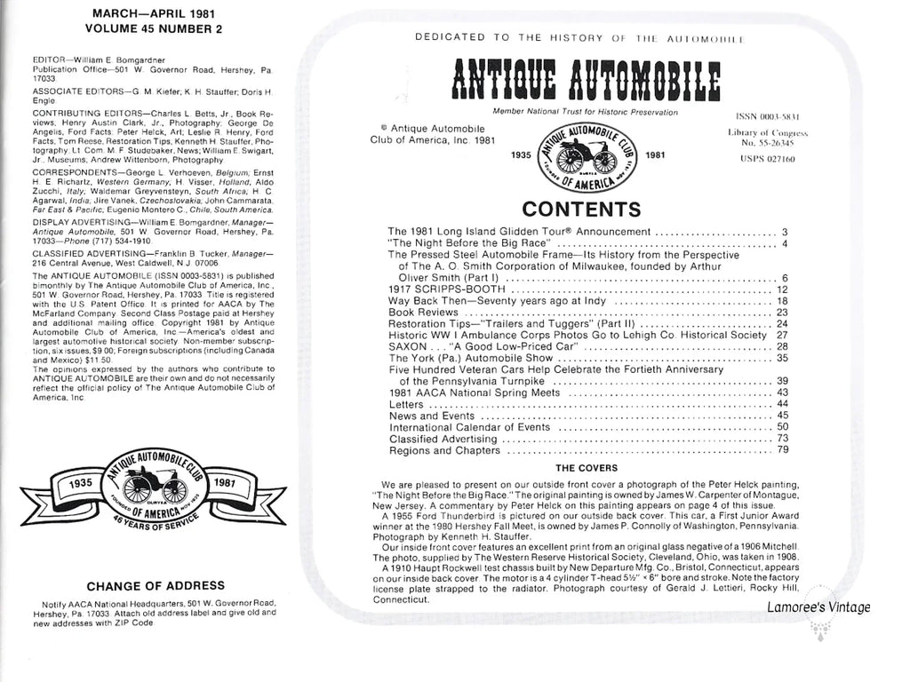 This issue of the Official Publication of the Antique Automobile Club of America, Inc, from March-April, 1981, is graced by a photograph of a Peter Helck painting,"The Night Before the Big Race". The picture depicts a busy garage preparing for Race Day. The back cover features a 1955 Ford Thunderbird.