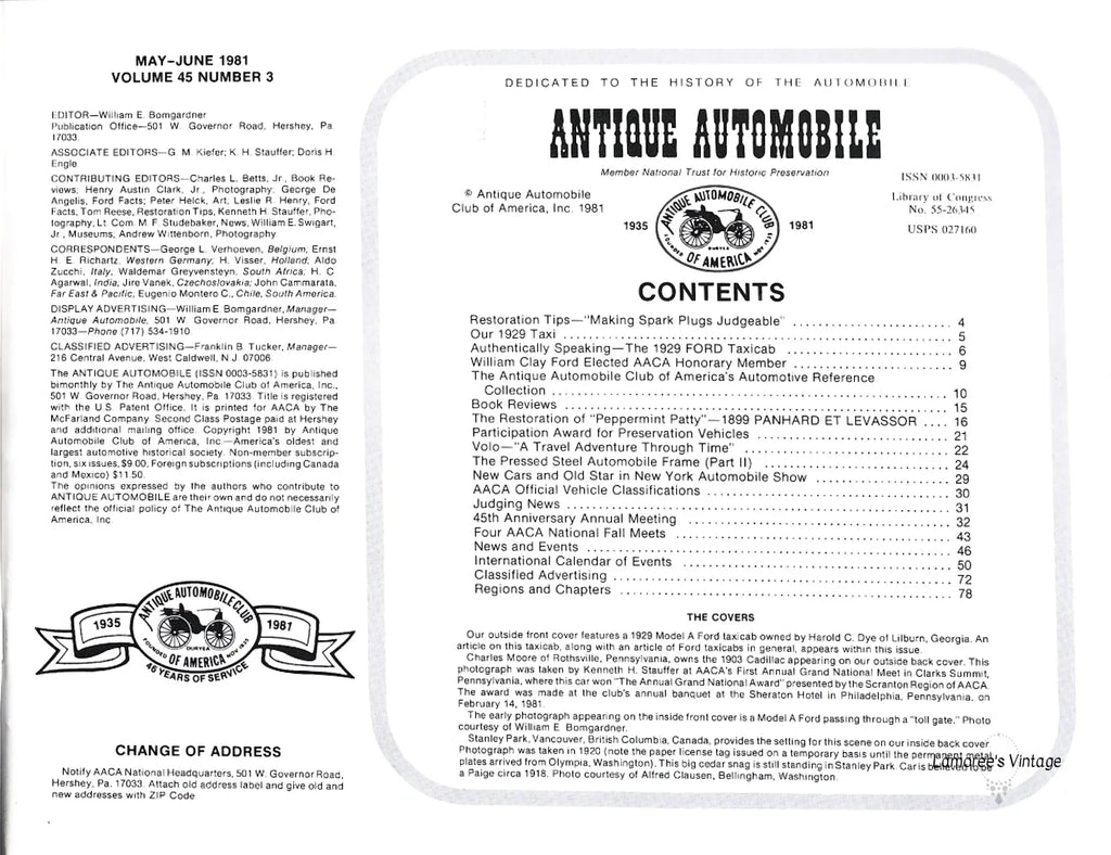 This issue of the Official Publication of the Antique Automobile Club of America, Inc, from May-June 1981 shows a 1929 Model A Ford. The back cover shows a 1903 Cadillac.