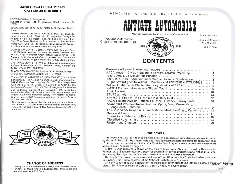 This publication from the Antique Automobile Association is Volume 45, Number 1. The group is dedicated to "the history of the automobile." Featured in this issue: restoration tips, 1930 CORD Convertible Phaeton, book reviews, meets, events and more. Well illustrated with black and white photos, there are 80 pages.