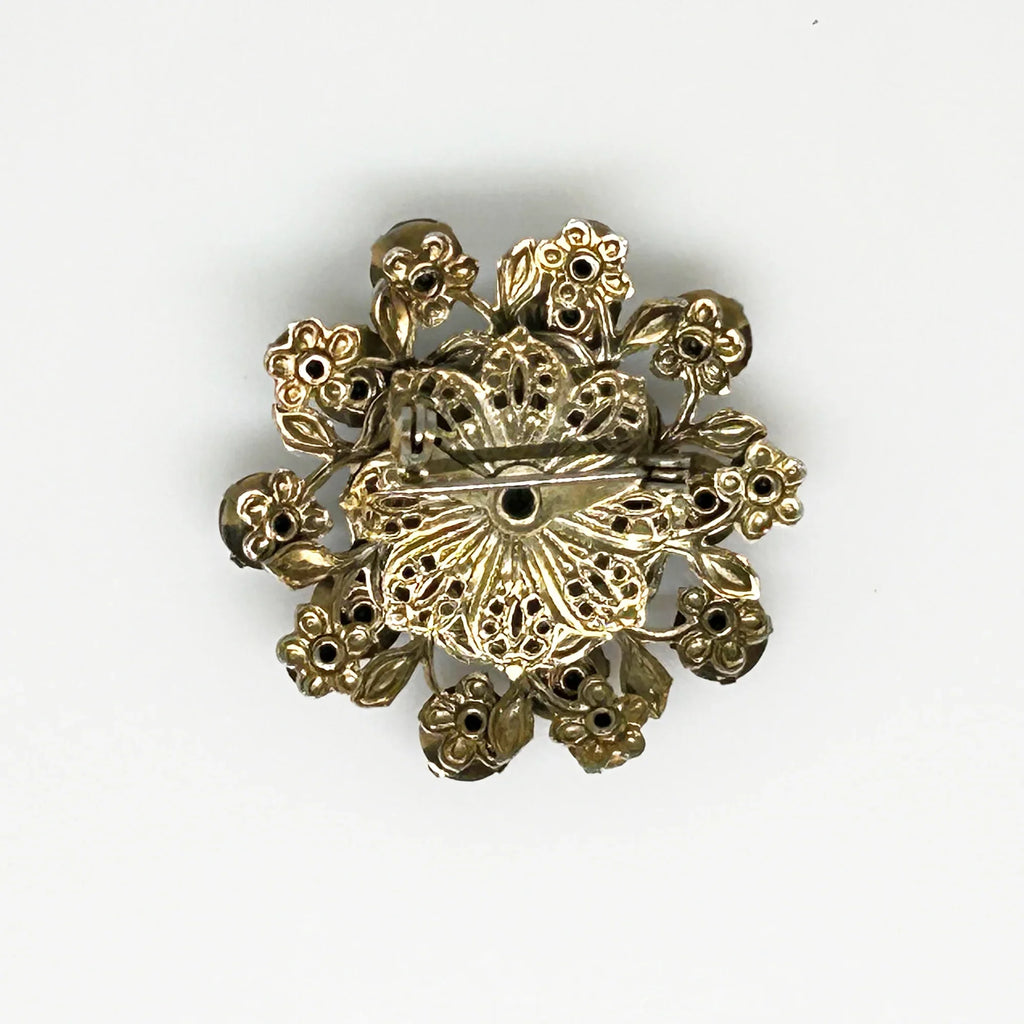 This dazzling brooch features a large octagonal purple stone at its center, surrounded by sparkling lavender and purple round stones. Its two-tiered design highlights the bezel-set centerpiece, making it truly eye-catching. With intricate details that showcase exceptional Czech craftsmanship, this vibrant piece is both elegant and full of character. It measures 1.5" across and it in very good condition.