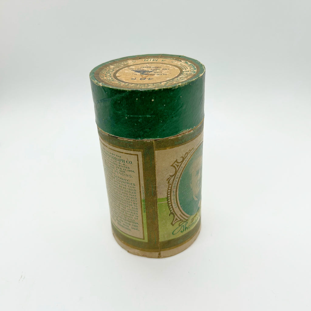 Contains the classic "Blue Danube Waltz" performed by the American Standard Orchestra. Measures 4" tall by 2" across, with a 4 1/2" tall container adorned with historical trademarks and patent information. Manufactured by the National Phonograph Co., showcasing genuine 19th-century recording craftsmanship