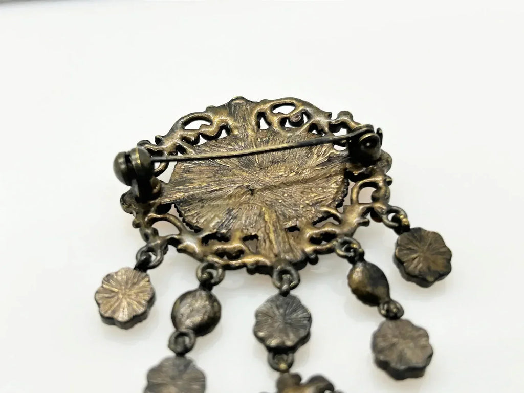 Level up your vintage jewelry collection with this stunning coral-hued brooch that captures timeless elegance. The piece showcases a luminous pale melon-orange centerstone framed by delicate star-shaped accents and peachy rhinestones that catch the light beautifully. Five graceful drops adorned with coordinating stones add movement and dimension to this wearable art. Crafted in warm antiqued gold with meticulous detailing on the reverse, this 2.5" treasure proves that vintage pieces never go out of style—they only become more precious. Free Shipping