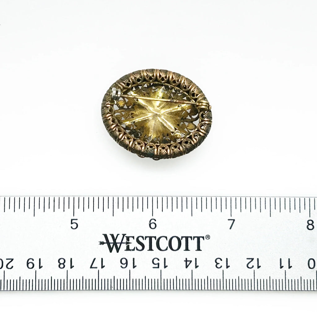 This exquisite vintage brooch showcases masterful European craftsmanship at its finest. The stunning amber-colored faceted oval stone is expertly prong-set and surrounded by intricate layers of ornate filigree work that demonstrates the exceptional artistry of its era. Measuring 1.5" across, this piece strikes the perfect balance between statement-making presence and wearable elegance. The secure stone setting and excellent condition make it ready to transition seamlessly from your collection to your everyday wardrobe or special occasions.
