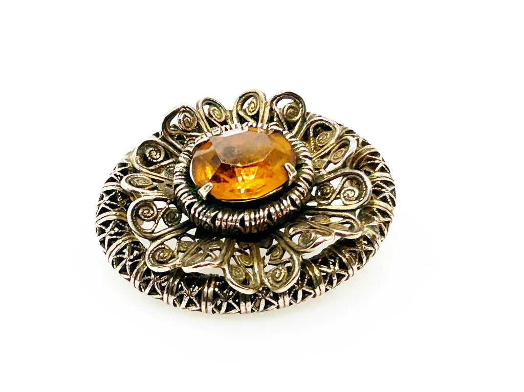 This lovely vintage brooch has a beautiful golden faceted oval stone surrounded by layers of elaborately detailed filigree. The workmanship is outstanding. The stone is prong set and secure; it's a very wearable brooch. It measures 1.5" across and is in very good condition.
