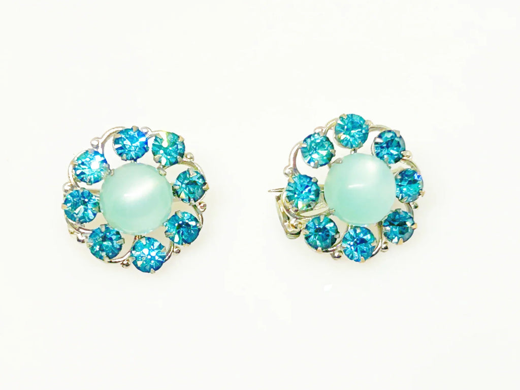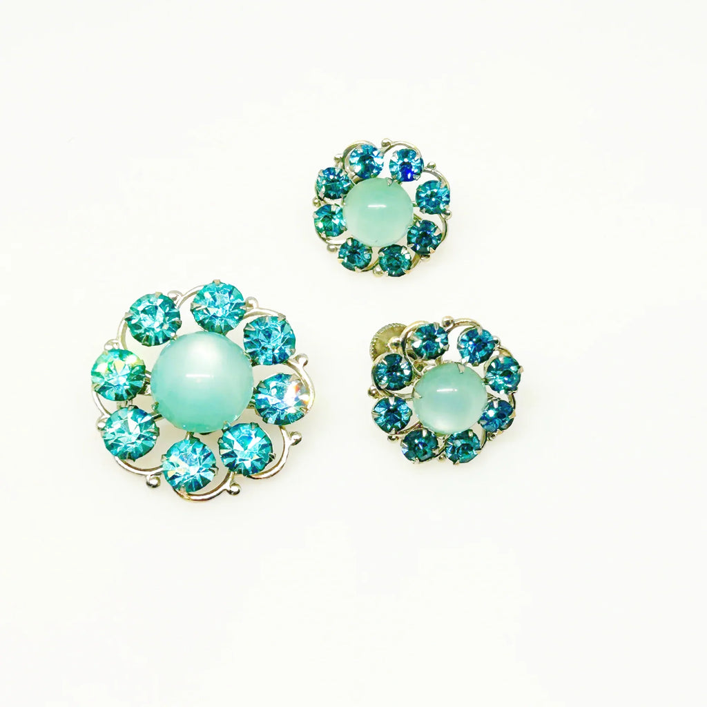 This is a hard-to-find set featuring a brooch, a pair of scatter pins, and screw-back earrings. The design showcases round, frosted light turquoise cabochons. Each features a center moonglow stone surrounded by bright, faceted, slightly deeper blue stones, all prong-set. The backs are highly elaborated and accent the designs perfectly. It's likely mid-century Czech or possibly unsigned Regency.