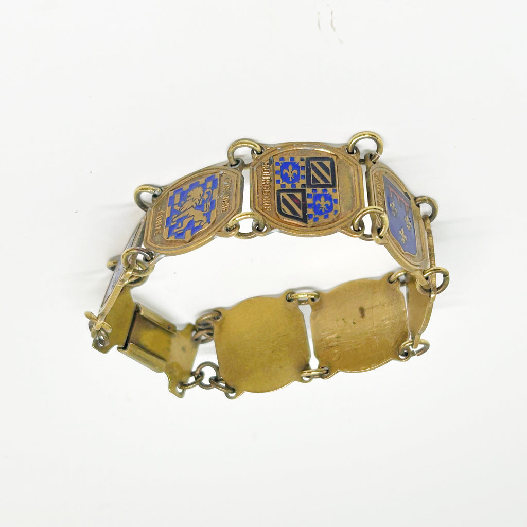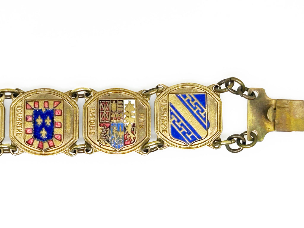 This is a vintage enamel and brass souvenir bracelet with heraldic crests from various regions of France.  It is a striking link bracelet featuring the heraldic crests of French regions. The bracelet is 7 inches long and includes crests for regions like Bourgogne, Touraine, and Normandie. The crests feature traditional heraldic motifs such as fleur-de-lis and lions. These bracelets became ppular as early as the 1930s through the 1960s, and were often referred to as "Grand Tour" jewelry.