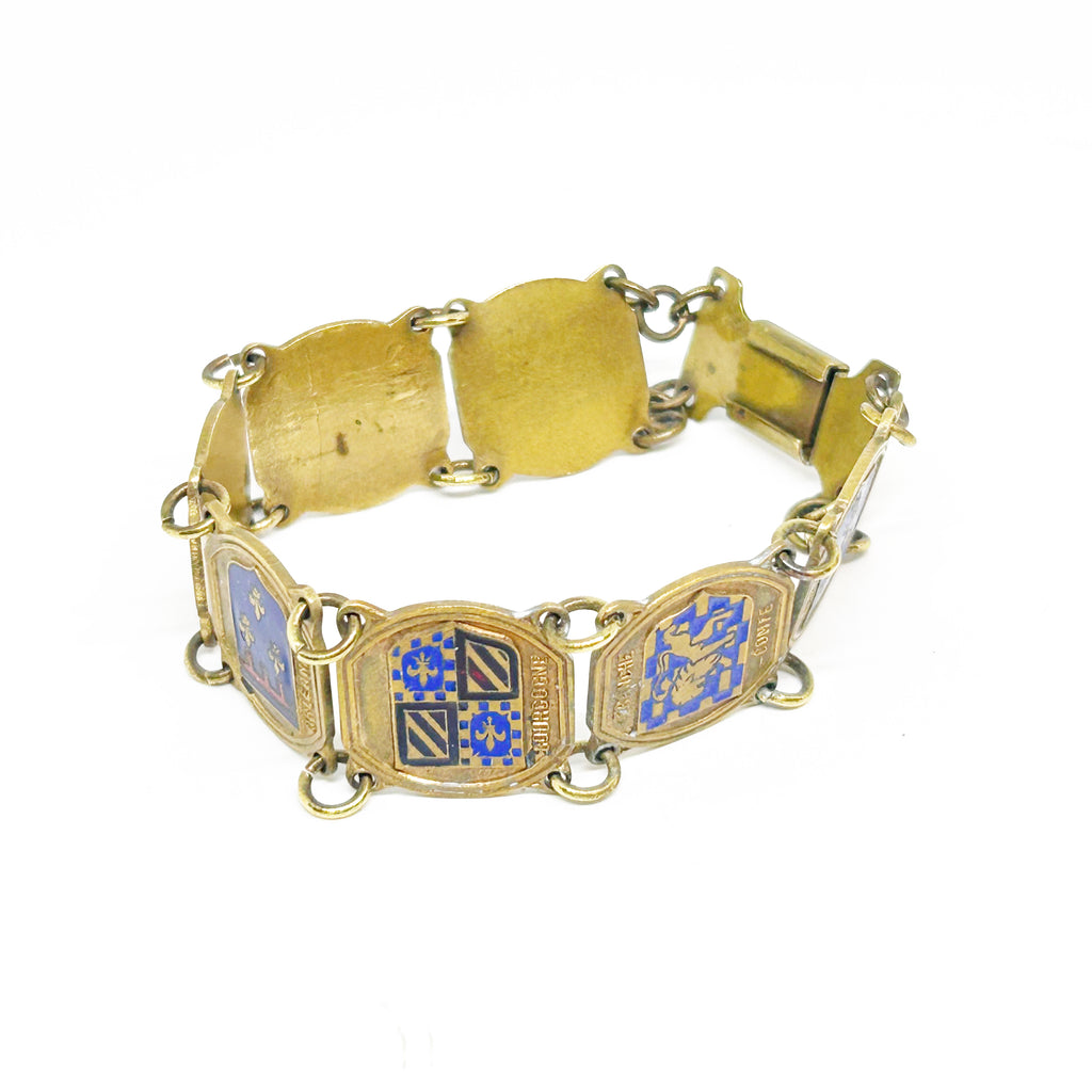 Perfect for vintage jewelry lovers: our Vintage French Souvenir Panel Bracelet provides a stunning display of French heraldic crests. Shop today!