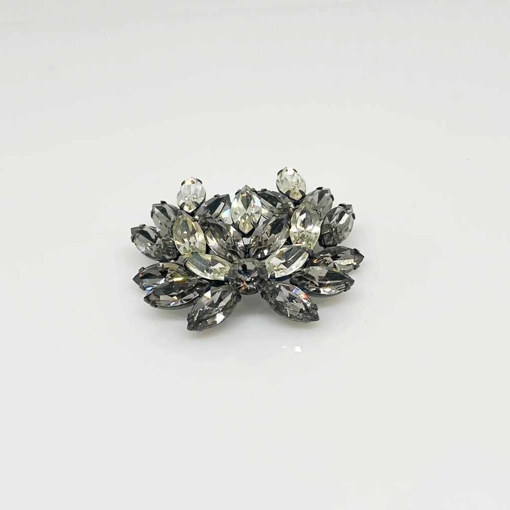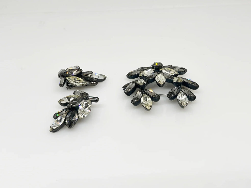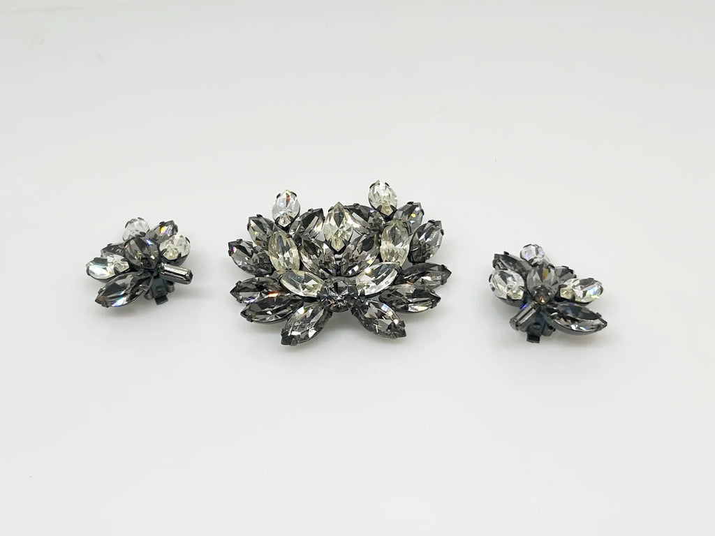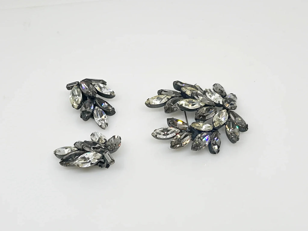 This is a gorgeous set of pin and earrings made with marquise and round shaped rhinestones in gray and clear. They are nestled in a layered, dark metal setting. The stones are standout bright and very sparking, great condition other than some wear on reverse. The earrings are clip on, hinge back. Free Shipping