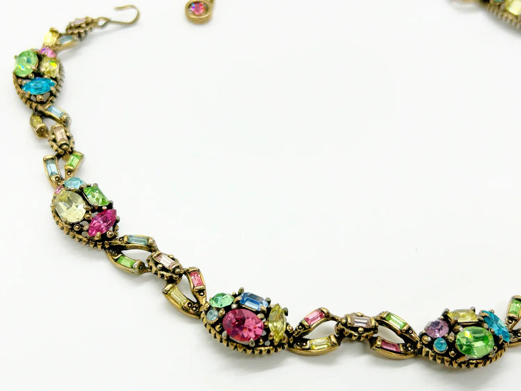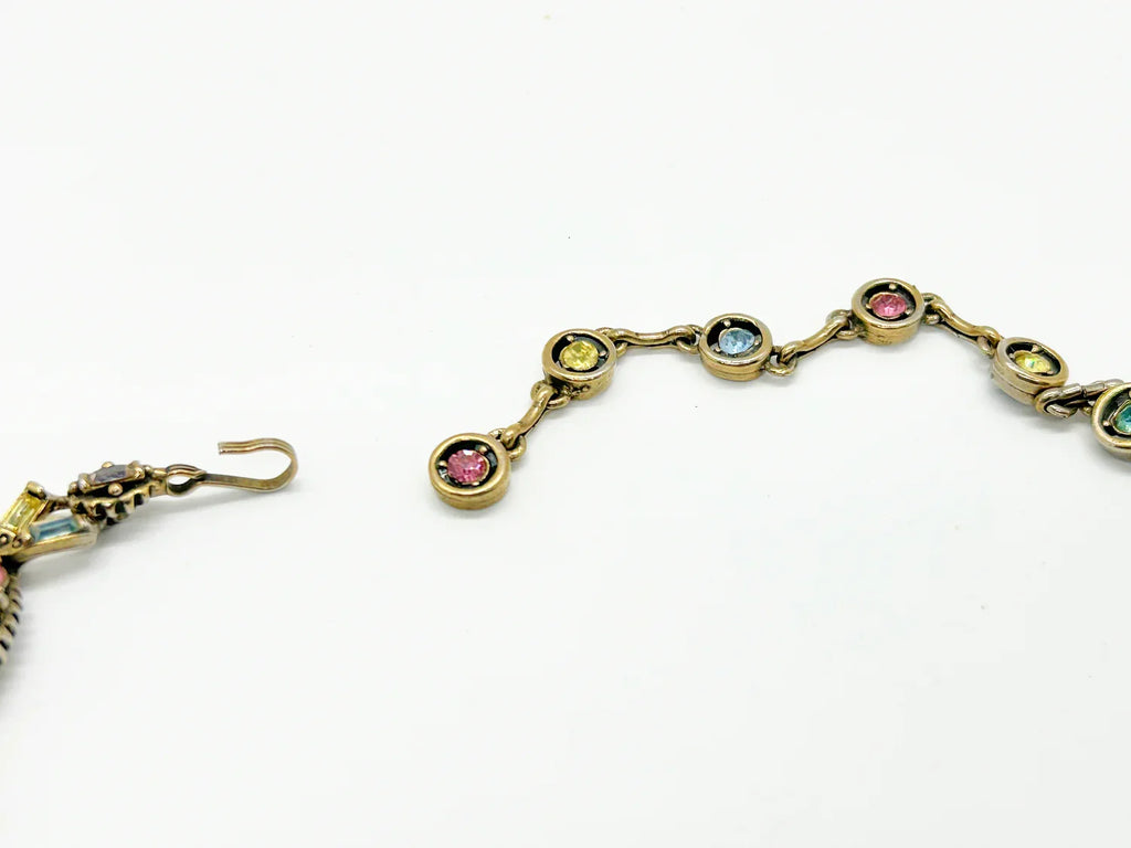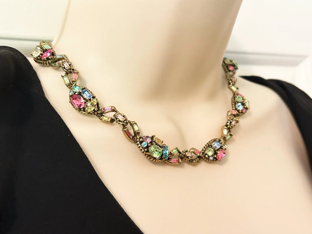 Here is a beautiful Hollycraft choker, set with lavender, pink, pale green, greenish yellow, and blue stones. They are set in ovals, with baguette, round, marquise, oval and round shapes; each element is connected to the next with a pair of baguettes with a baguette in the center. It is not signed. All stones appear present. Free Shipping