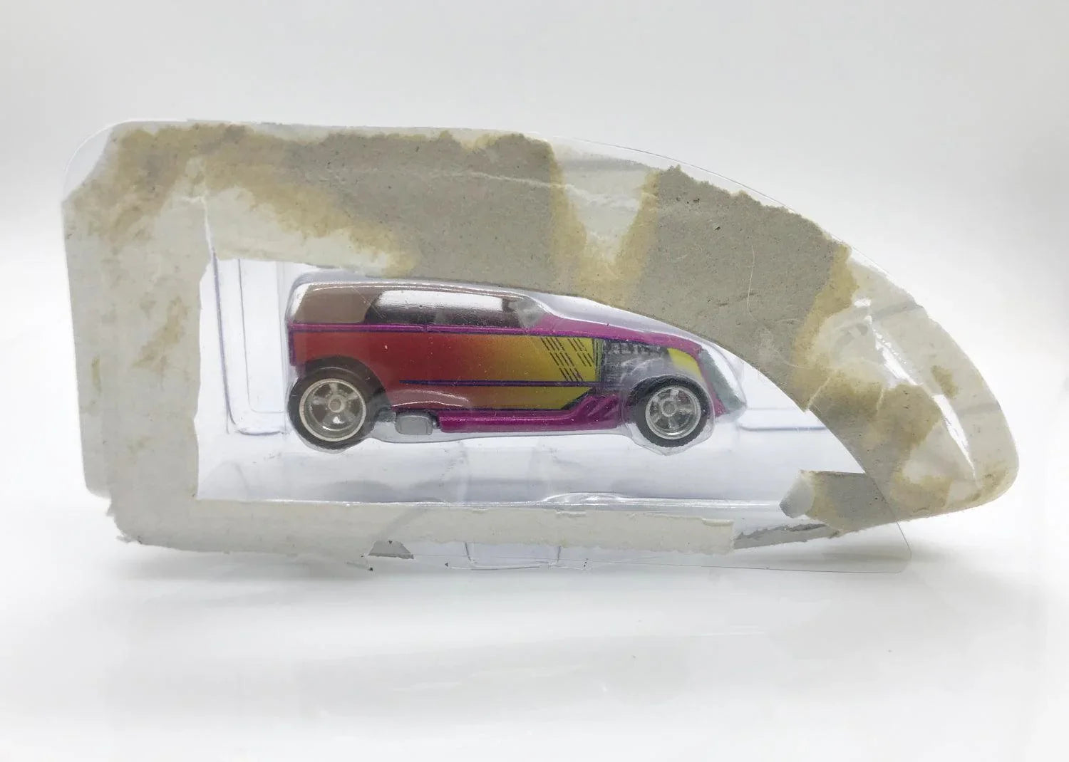 100% Preferred: Street Rodder; metalflake magenta with removable brown roof; it has yellow, red, orange and black tampos in an ombre patten. The interior is brown and it has clear windows. The car RR5Sp wheels, and was made in Malaysia. It is 1:64 scale and was designed by Gary Saffer, and has elements of a modified Ford Phaeton 2-door. I've never removed it from the clamshell-packaging.