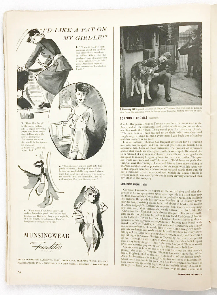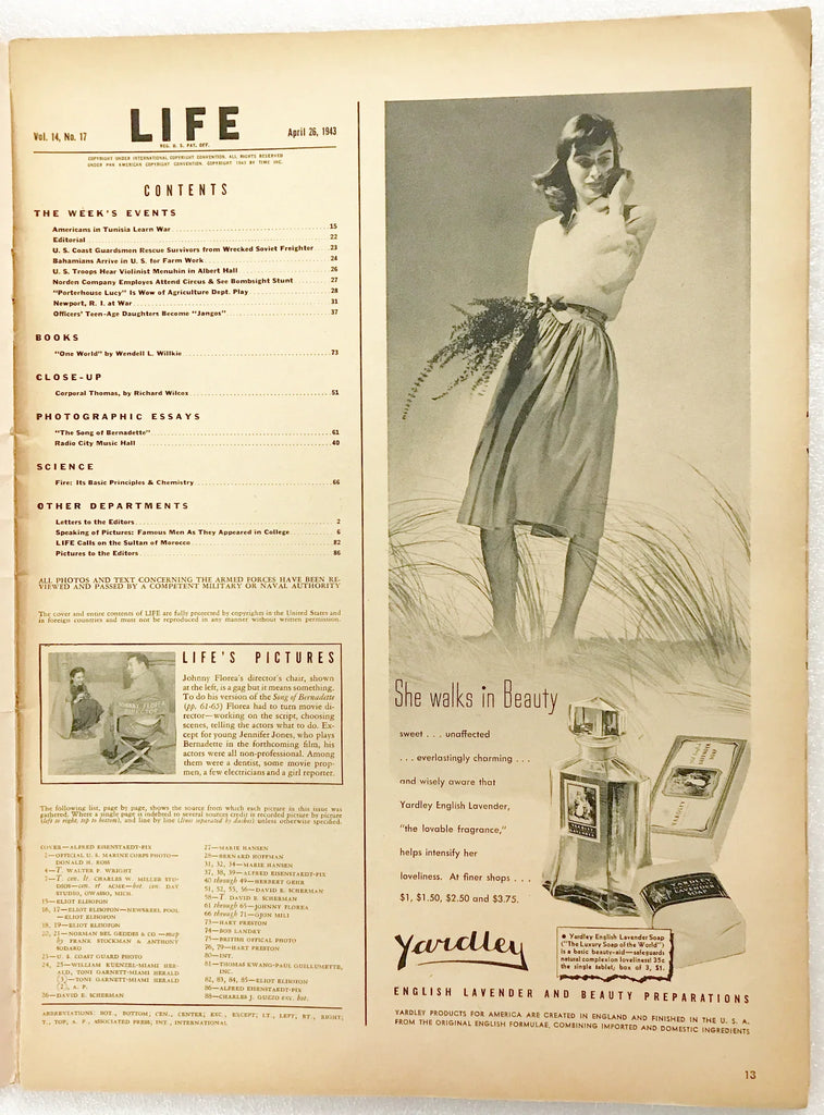 Cover: “Jango” and review of the movie “Song of Bernadette” starring Jennifer Jones; U.S. Troops hear violinist Yehudi Menuhin in London’s Albert Hall; officers’ teenage daughters become “Jangoes” – junior Army-Navy Guild nurses; excerpt of “One World” by Wendell Wilkie; fire, American troops in Tunisia; “Coffin Corner” in South Africa; a company entices crowds by showing a bomb explode a pickle in a barrel, celebrating a new weapons sight; Newport, RI Mansions are home to naval operations; color multi-page spread on Radio Music Hall; the Sultan of Morocco.