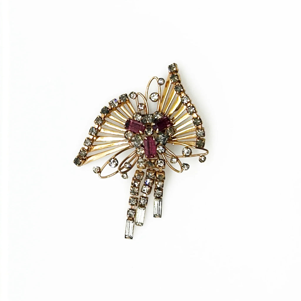 Introducing the M&S 1/20 12kt G.F. Abstract Butterfly Brooch/Pendant — the perfect vintage solution to your style dilemmas. This exquisite butterfly brooch pendant highlights delicate abstract artistry paired with shimmering grey and purple/pink rhinestones, offering a luxurious yet subtle sparkle. Its classic design and historical provenance make it a standout accessory for any occasion. It's versatility-- it can be worn as a pendant or a brooch, giving the wearer many more opportunities to enjoy it.
