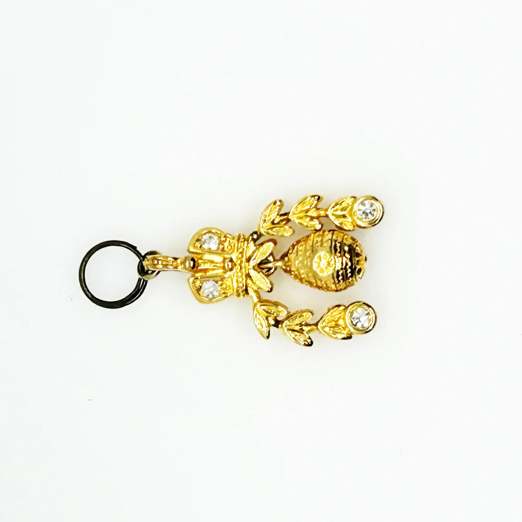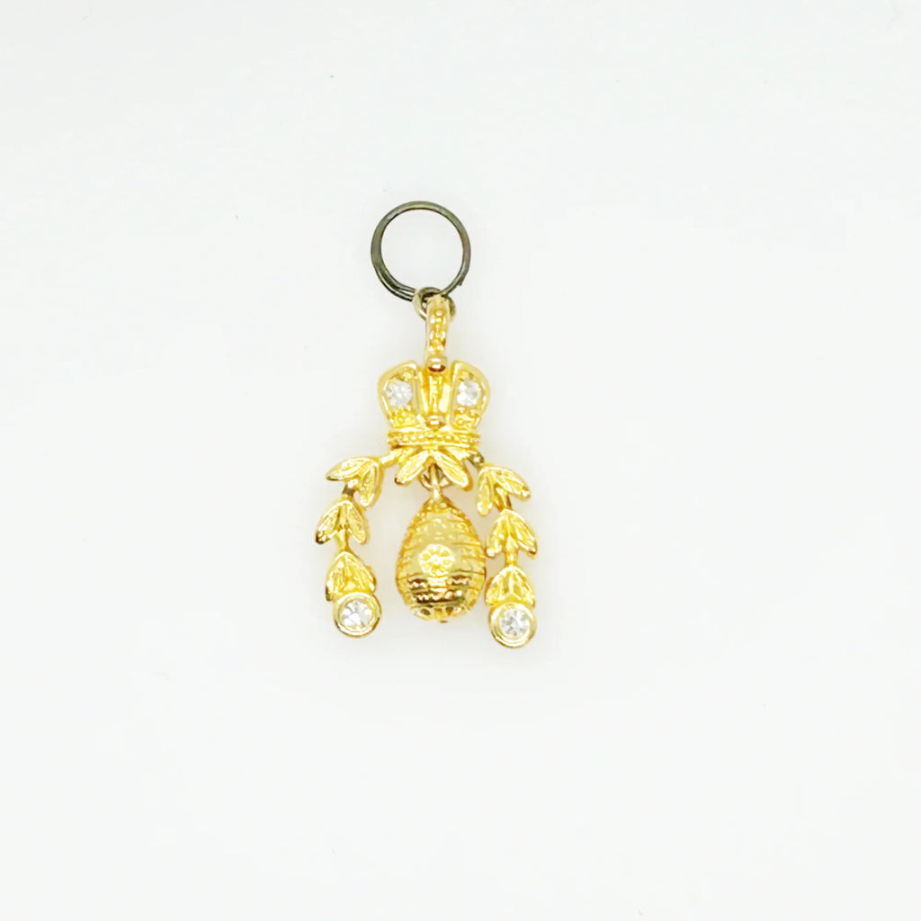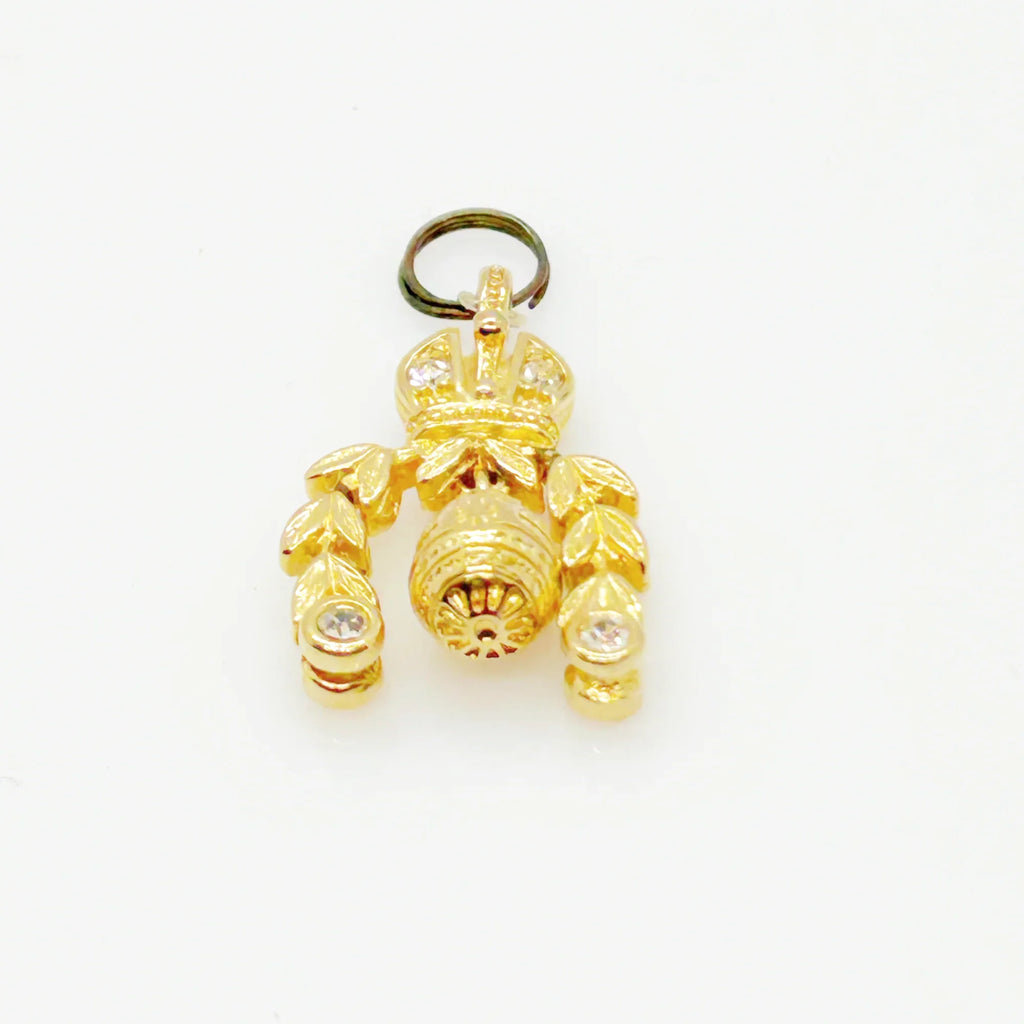 This is an unusual and regal pendant, in rich gold with a rhinestone studded crown, which adorns a laurel wreath. In the center is a dangling gold egg. The design reminds me of the various pre-revolutionary style of Russian, especially the egg, referring back to the works of Faberge. This is an especially high quality piece. It measures 1 3/4". The jump ring is not original. The chain is not original to the pendant, but is included.