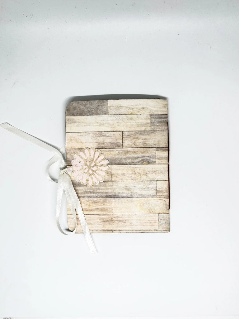 Design themes are wood grain, pale pinks and greens, flowers, black filigree, and pale satin ribbon to close. This unique mixed media work measures 5.25" tall by 4" across.