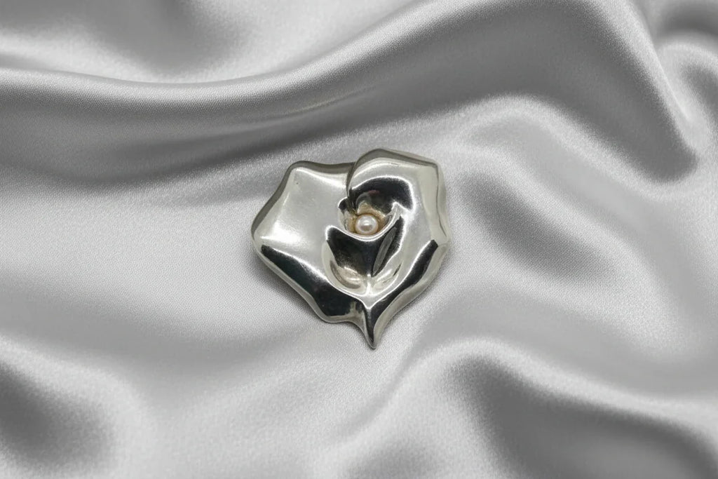 The design of this floral brooch captures the gentle curves and folds of a calla lily. The brooch’s sculpted surface creates a tactile experience reminiscent of soft, real petals. Notice how the form subtly hints at a heart shape, making it not only a tribute to flowers but also a symbol of love and elegance. Every angle of this rose brooch reveals thoughtful craftsmanship, appealing to those who appreciate refined details and romantic inspiration in jewelry.