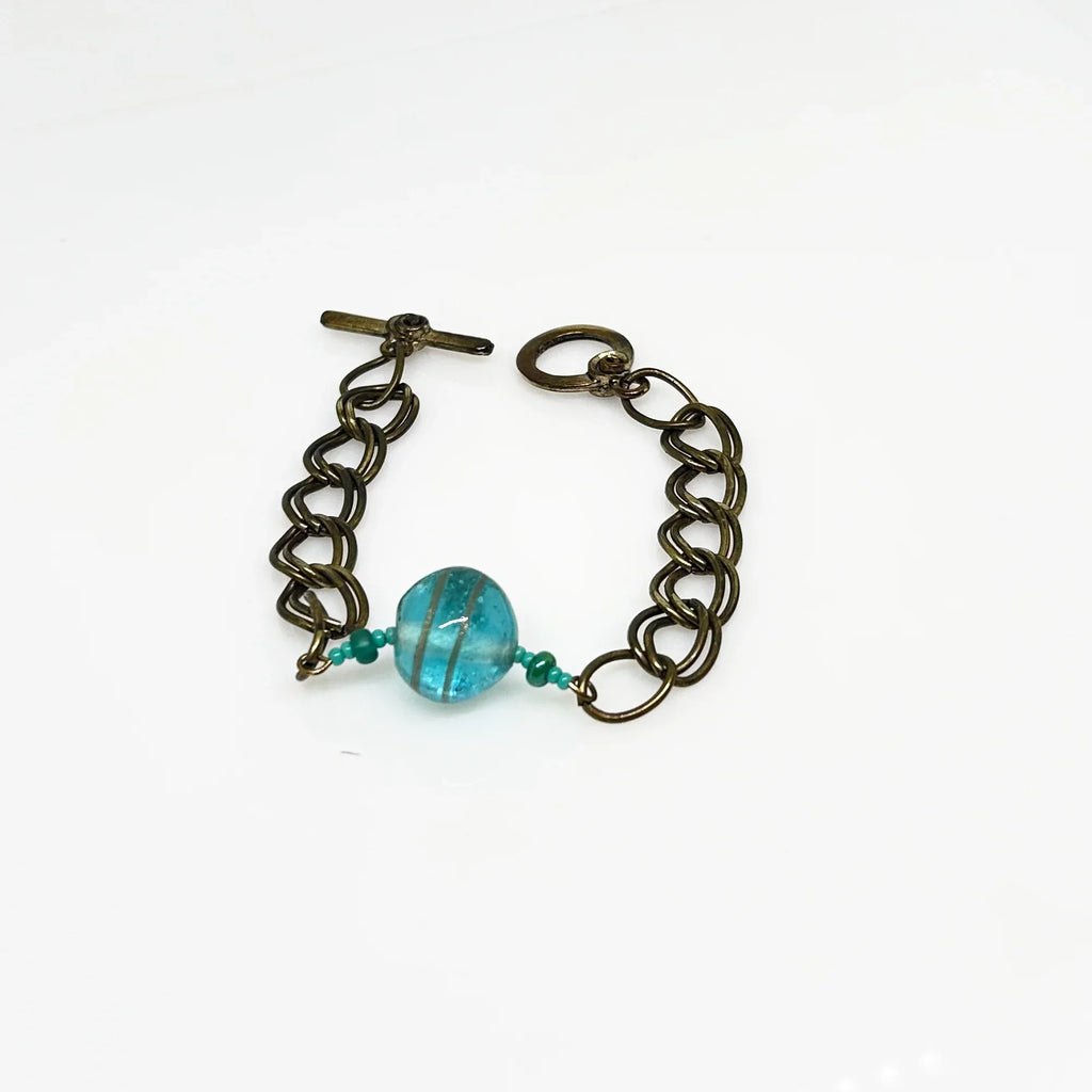 This captivating vintage bracelet boasts two rows of links on either side of a stunning blue glass marble with shimmering gold stripes. The glass sphere is flanked on either side by tiny turquoise and blue beads. It is 7 1/2" in length and features a charming toggle clasp. The dazzling combination of gold and blue will elevate any outfit and accent your personal style in a unique way. The metal has acquired.a lovely patina over the years. With its unique toggle clasp, this bracelet is not only stylish but also easy to put on and take off. You'll love the versatility and quality of this piece as it adds a touch of elegance to your everyday look.