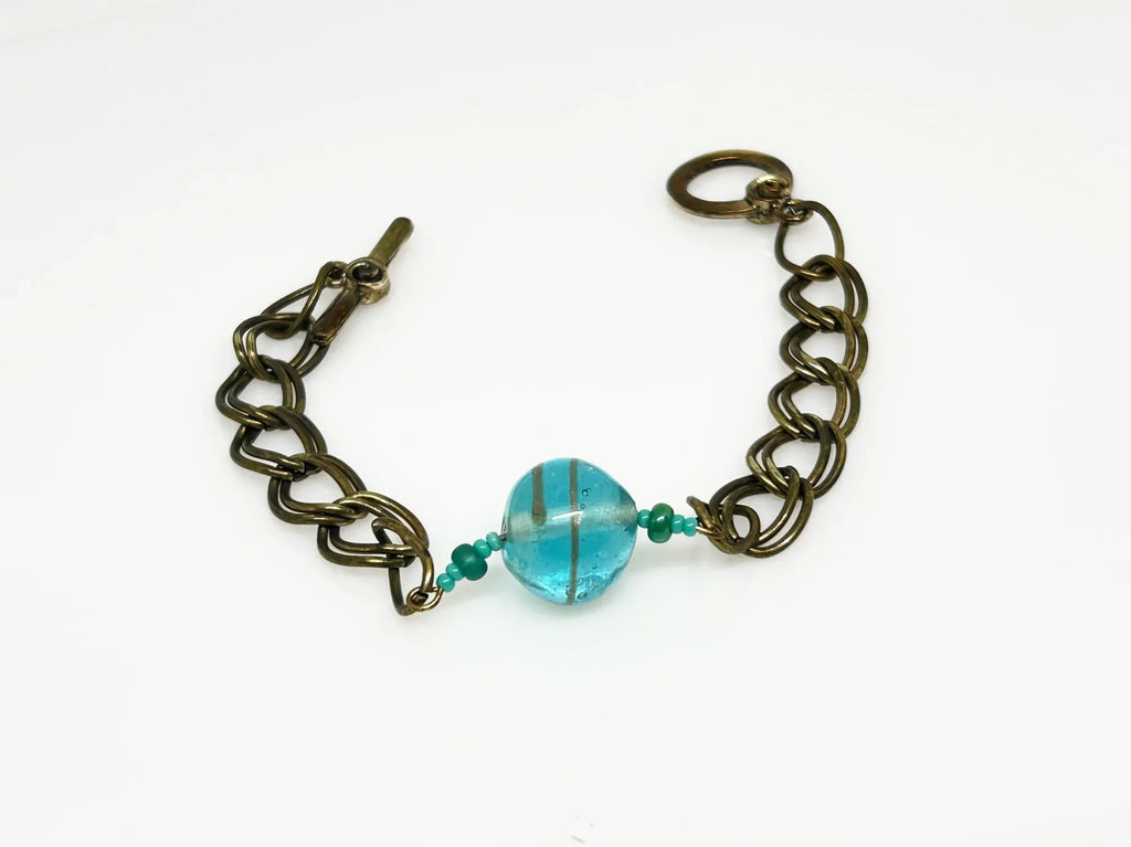 Unique Vintage Double Link Bracelet with Clear Aqua Blue Marble