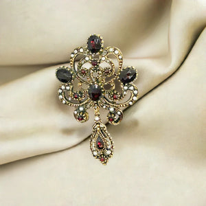 Featuring a dazzling combination of teardrop, round, and oval garnet-shaded gems, this treasure radiates sophistication and allure. Superbly placed in antiqued gold metal and embellished with dainty seed pearls, it boasts a length of 2.5 inches, making it the ideal accessory to elevate many the ensemble. Free Shipping