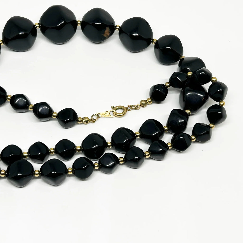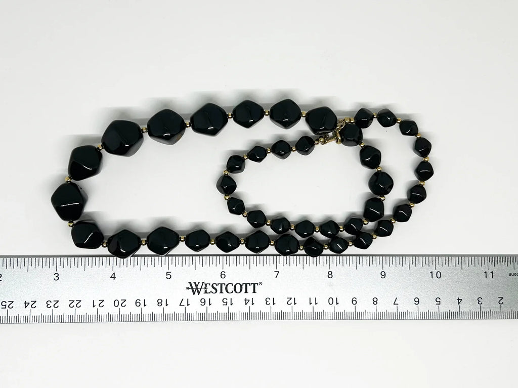 Crafted in 1986, this vintage Avon necklace features a graceful chain of graduated, asymmetrical black beads separated by gold-tone bead separators. Its spring clasp is signed “Avon” in block letters. This exquisite piece measures 24” long, complementing black or solid-color outfits while providing a bold foundation for contrasting accessories.