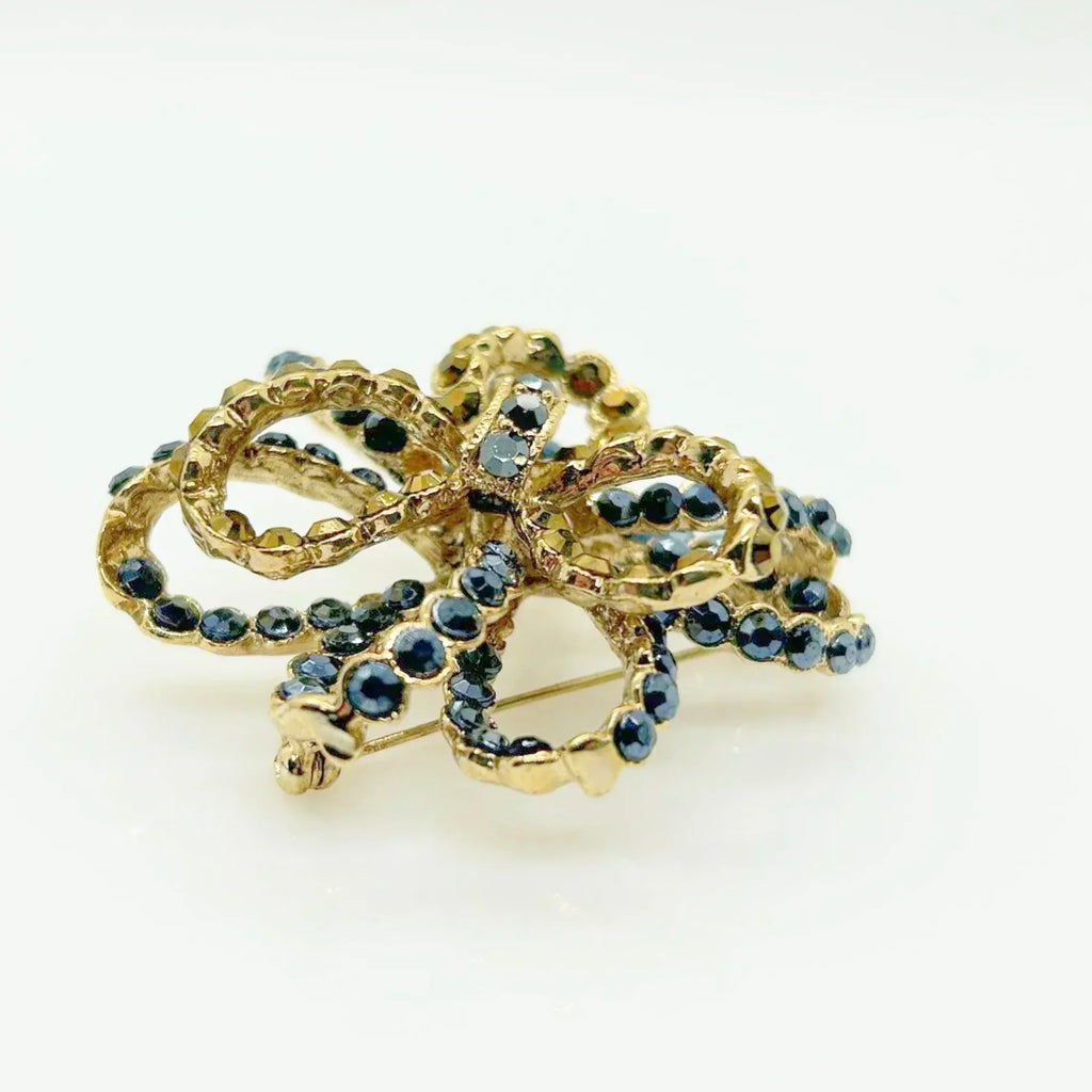 This vintage ribbon bow brooch boasts exquisite craftsmanship and stunning beauty. Adorned with ribbons featuring dark blue and golden rhinestones, tied into a grand bow, this piece is truly magnificent. Its measurements span 2 inches in width, making it a standout and one-of-a-kind brooch. This is identical to a signed Nolan Miller piece available here :Nolan Miller Gold Bow MIB. .Free Shipping