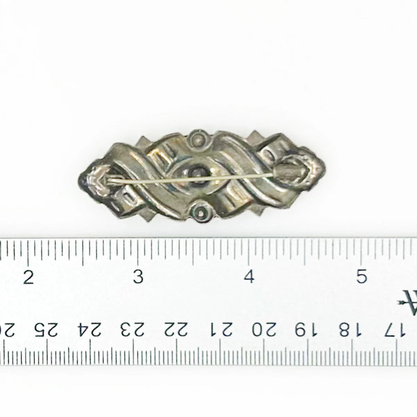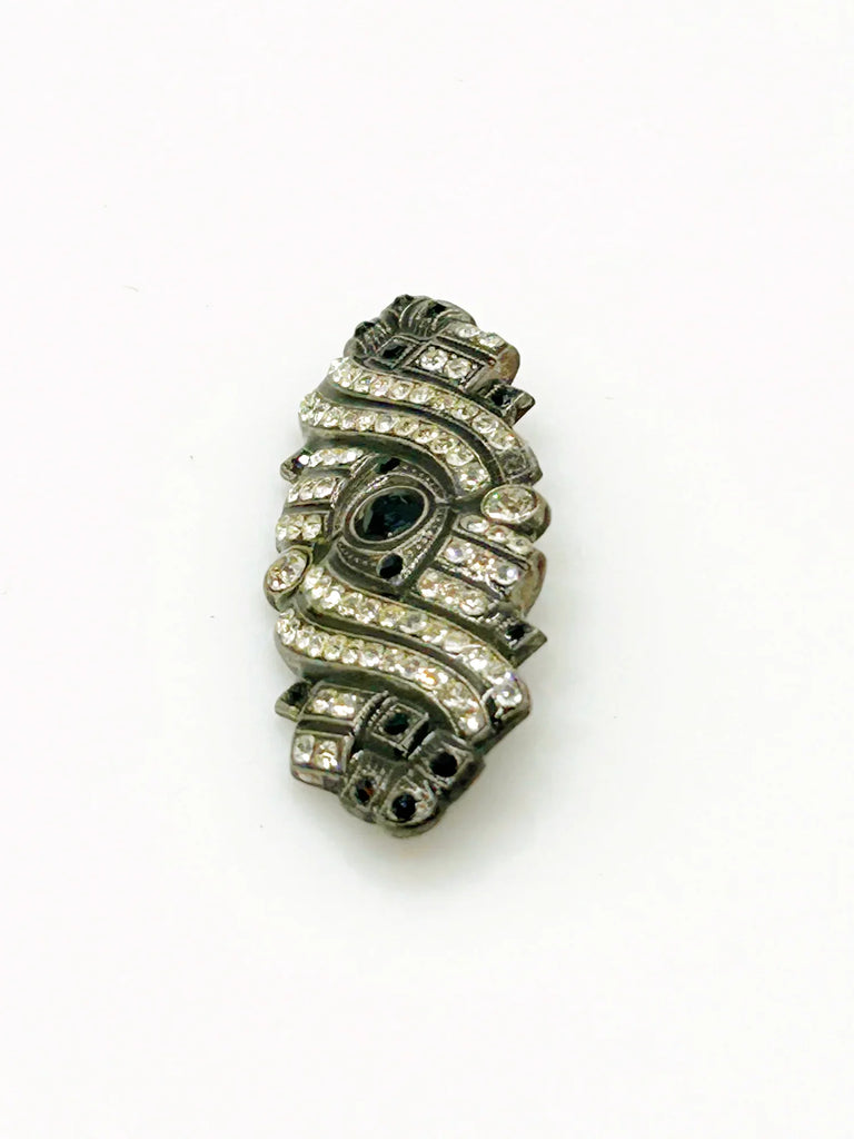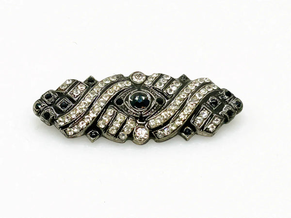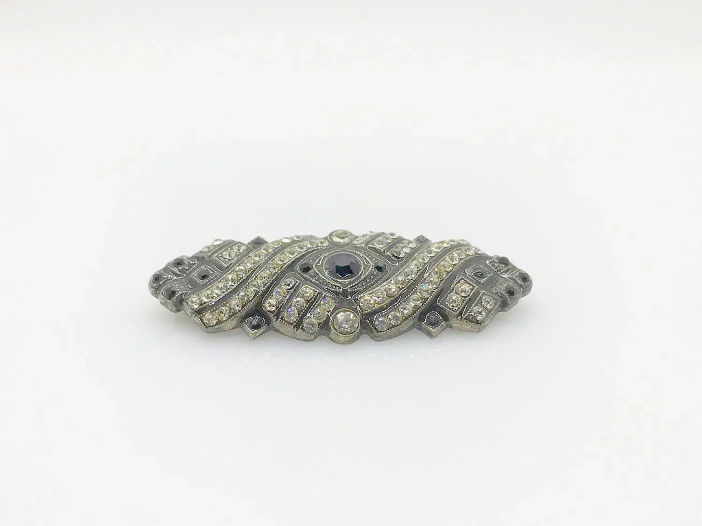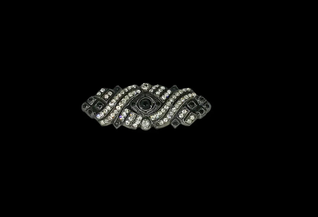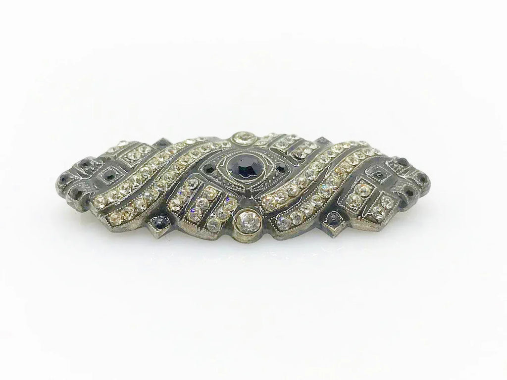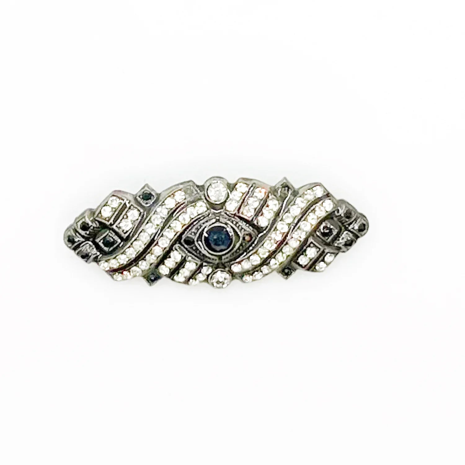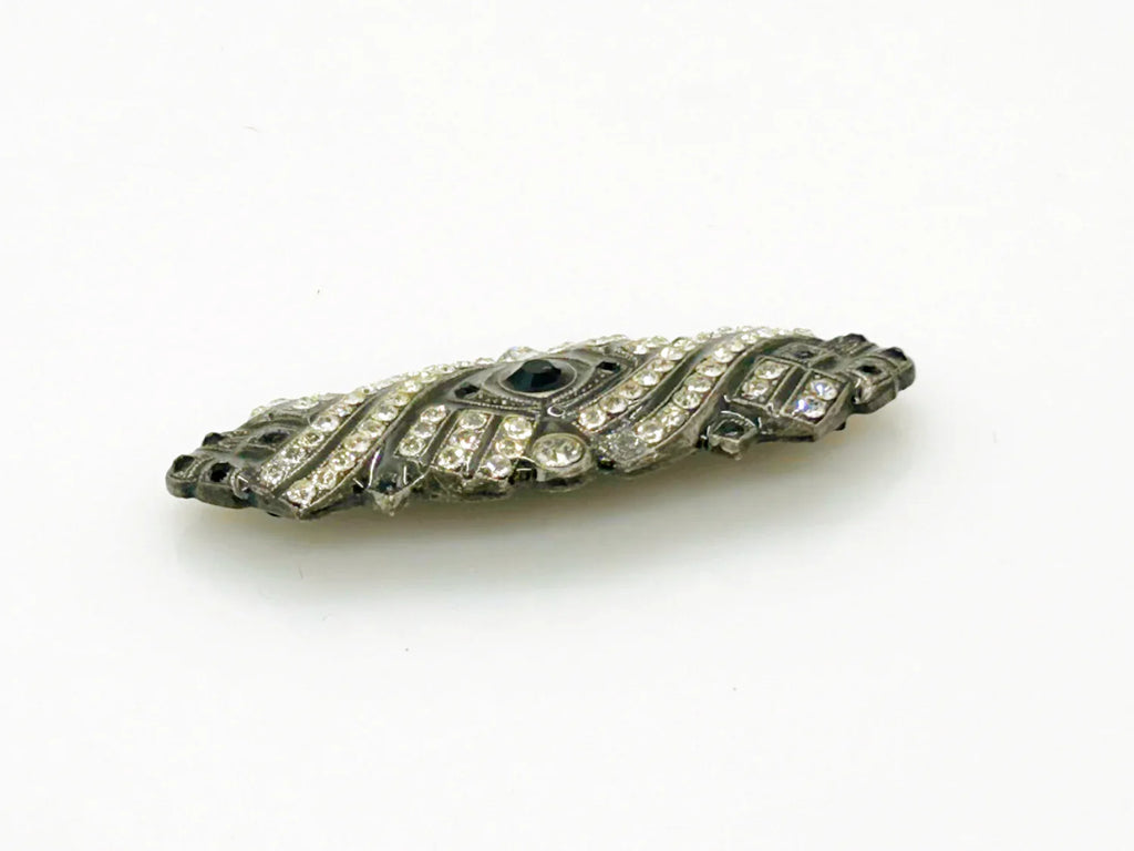 Make a statement with this stunning Vintage Deco Brooch. The contrast of bright white rhinestones and darkened metal exudes a sense of elegance and sophistication. At 2.25" long, it's the perfect size to add a touch of chic to any outfit. And with its excellent condition, you can be sure it will always make a bold and beautiful statement for years to come!