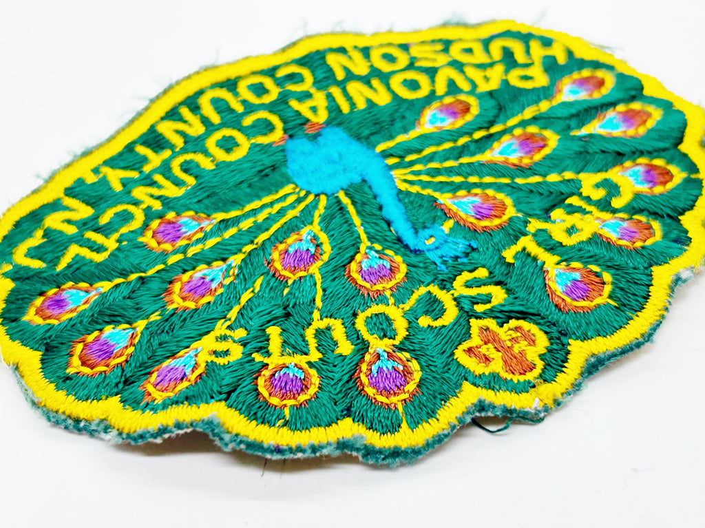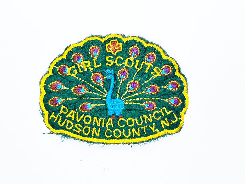 Celebrate Girl Scout heritage with this authentic vintage Pavonia Council patch from Hudson County, New Jersey. The striking peacock design served as the council's proud symbol, representing the organization's values and spirit. Hand-embroidered on quality polyester or cotton fabric with a finished merrowed edge, this 1970s patch carries the legacy of a council that has since merged with others. The beautiful peacock extends 4" across by 2.75"" tall. across. Whether you're a longtime scout, a collector of scouting memorabilia, or someone who cherishes vintage badges of achievement, this piece connects you to decades of Girl Scout tradition and empowerment. A meaningful addition to any collection.