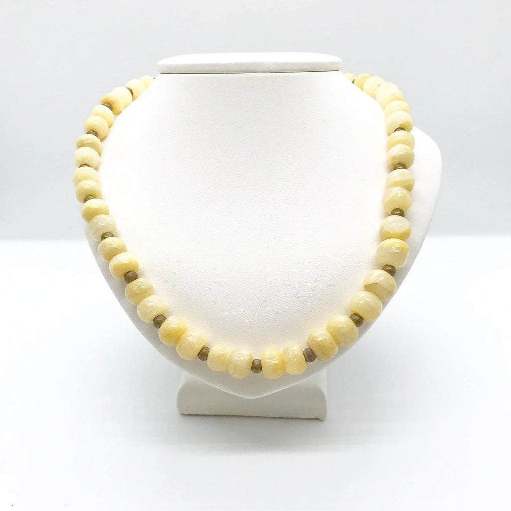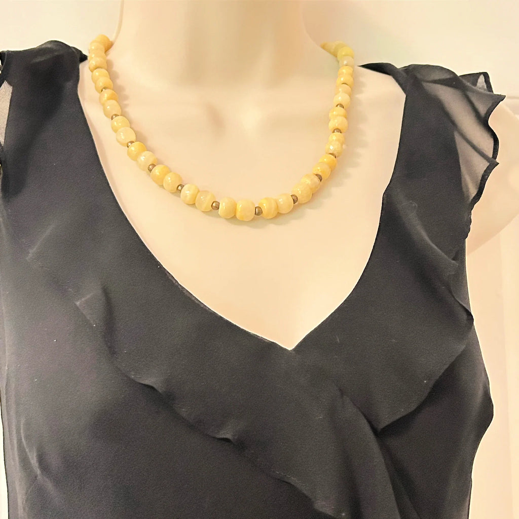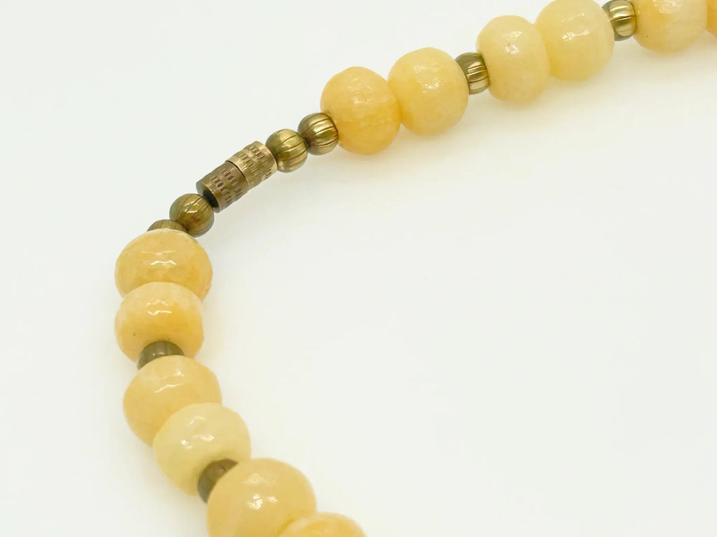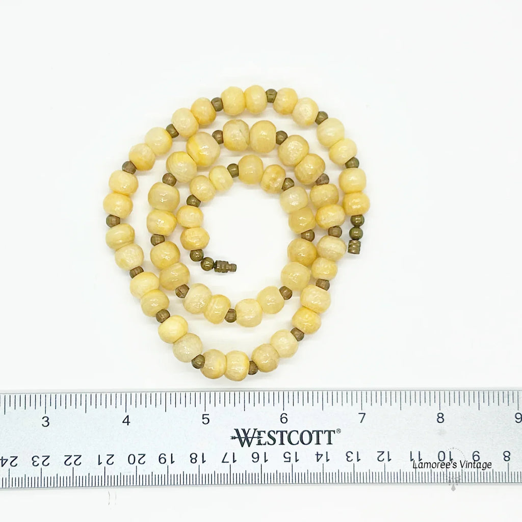 Indulge in the timeless allure of a vintage piece with our stunning pale lemon glass bead strand. Every delicate bead is a unique and textured masterpiece, perfectly complemented by luxurious brass separators. With a length of nearly 20 inches and a barrel clasp, this strand is the epitome of elegance and sophistication. Enhance your collection with a piece that exudes opulence and exclusivity.