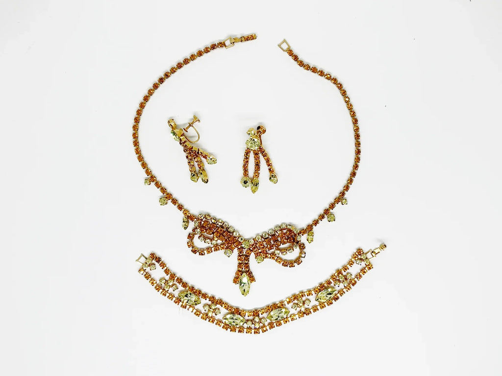 Elevate your jewelry collection today with a rare vintage set boasting intricate craftsmanship and dazzling rhinestones. Perfect for making an unforgettable impression wherever you go, the harmonious blend of golden hues and delicate lemon rhinestones makes this set unmatched in beauty and elegance. This sophisticated parure is an excellent choice for those who love exquisite vintage accessories that last through generations.