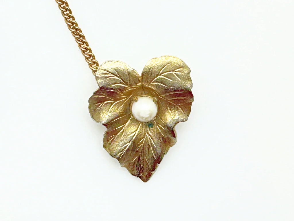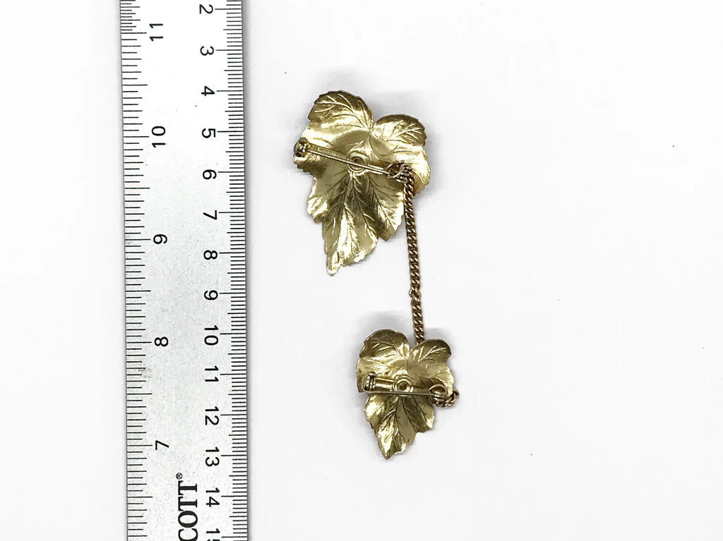 Discover the charm of mid-century elegance with this authentic pair of Sarah Coventry "Chit-Chat" sweater guards from the late 1950s. These beautifully crafted leaf-shaped brooches feature exquisite detailing and versatile styling options—wear them connected by the removable chain as a unified statement piece, clip them to your collar, or showcase each as an independent brooch. The larger leaf spans 2 inches while its companion measures 1.5 inches, connected by a delicate 3-inch chain. There is wear to the faux pearls, and a small bit of verdigris on the smaller leaf. Perfect for vintage jewelry collectors and fashion enthusiasts seeking timeless accessories with genuine character.