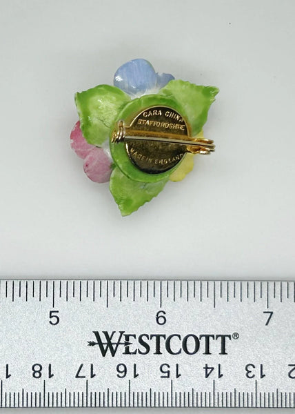 This vintage brooch (probably made in the late 1940s-1950s) is made three petite flowers, a yellow, a pink and a multi colored on, all sitting on green leaves. It is in very good condition, and measures 1.5” across at the widest point. On the back is a round metal plaque with both the clasp and “Cara China Stafford shire” and “Made in England” in all capital letters.