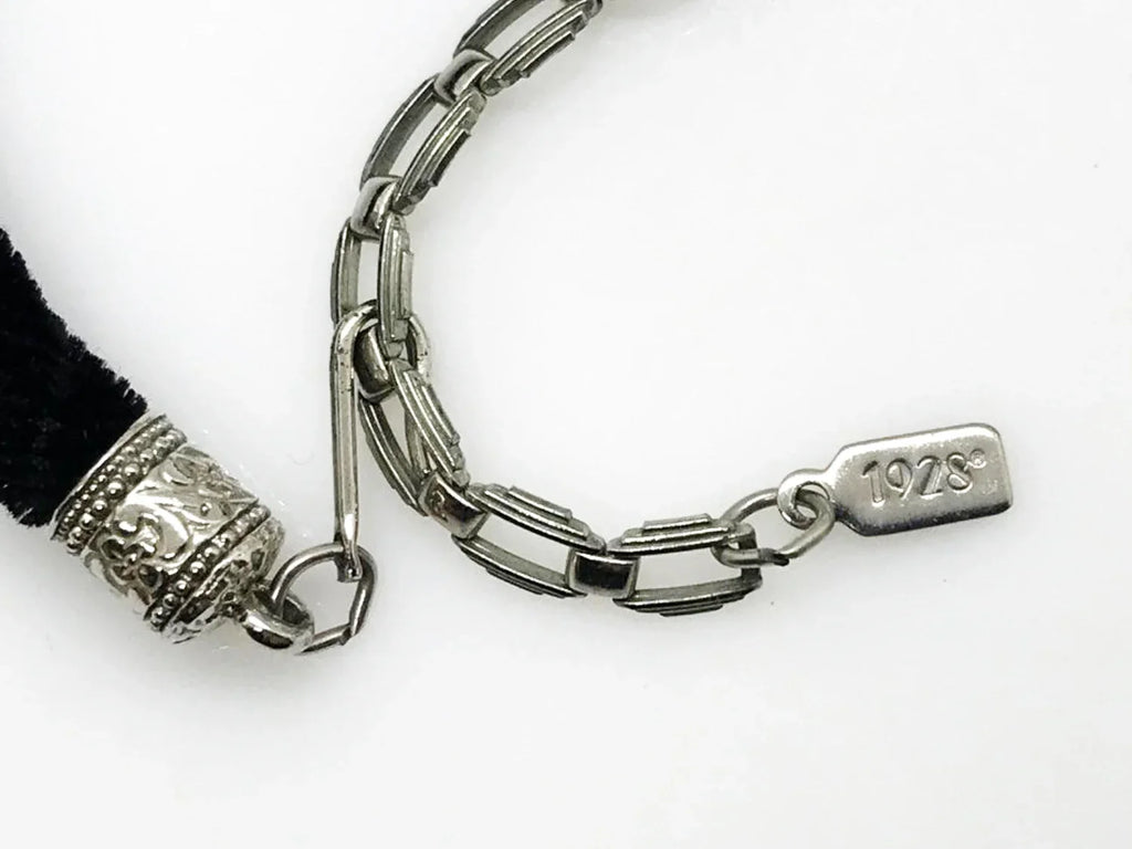 Embrace timeless elegance with this stunning Vintage 1928 Ornate Cameo on Black Velvet Choker. A handcrafted oval cameo, featuring a right-facing female profile on a dark gray/black background, is the focal point of this piece. Encased in a silver tone frame with a delicate rope and scroll border, this necklace exudes classic sophistication. The pendant hangs from a luxurious black velvet cord, complete with a convenient hook clasp and extender for a customization fit. As a final touch, the rectangular hang tag is signed "1928" as a mark of unmistakable quality and charm. Elevate any outfit with this necklace that embodies grace and refinement.