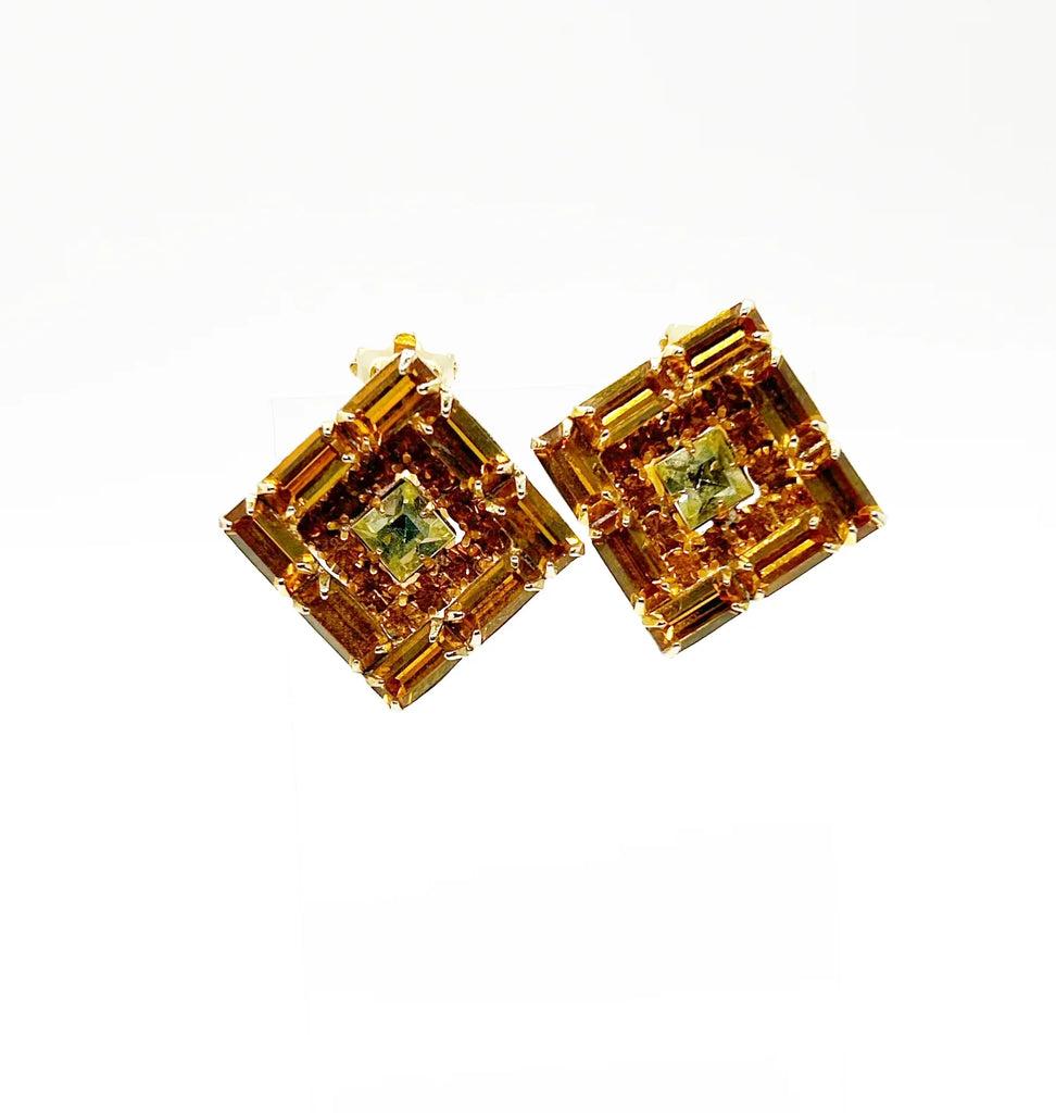 These exquisite vintage clip-on earrings showcase multiple layers of luminous golden, citrine colored baguette rhinestones arranged in a captivating geometric design, centered with a soft lemon-hued square stone that catches the light beautifully. Measuring approximately 1 inch in diameter, this pair remains in pristine condition, a testament to their quality construction and timeless appeal.