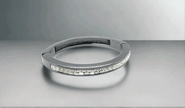 This black metal hinged bangle bracelet features clear baguettes individually set in its sleek frame. Its 2.5" x 2.25" interior can be opened and magnetically secured, offering an elegant accessory ideal for special occasions. Its condition is excellent. Dazzle and shine at your next special event with this stunning hinged bangle bracelet. The .25" wide frame is adorned with sparkling clear baguettes, creating a mesmerizing effect. The interior can be easily opened and securely fastened and provides a comfortable fit for any wrist size.