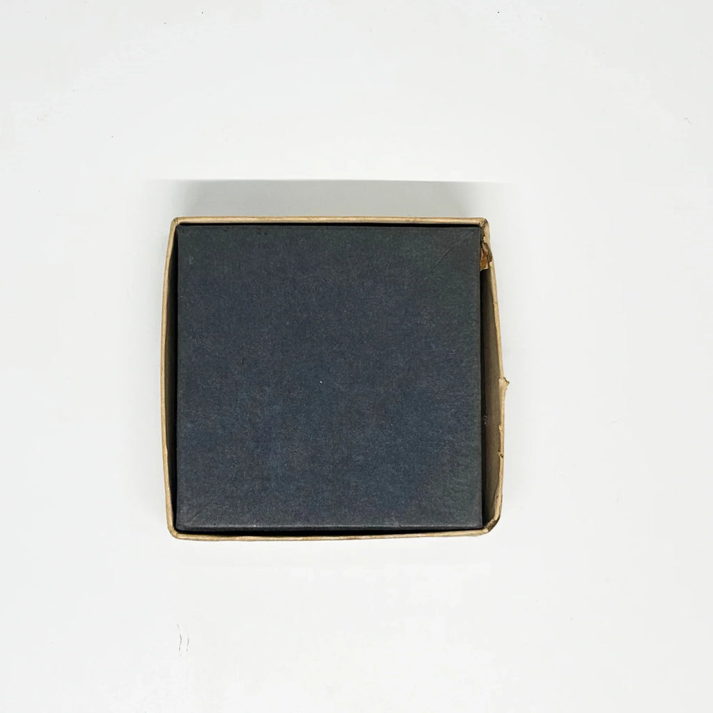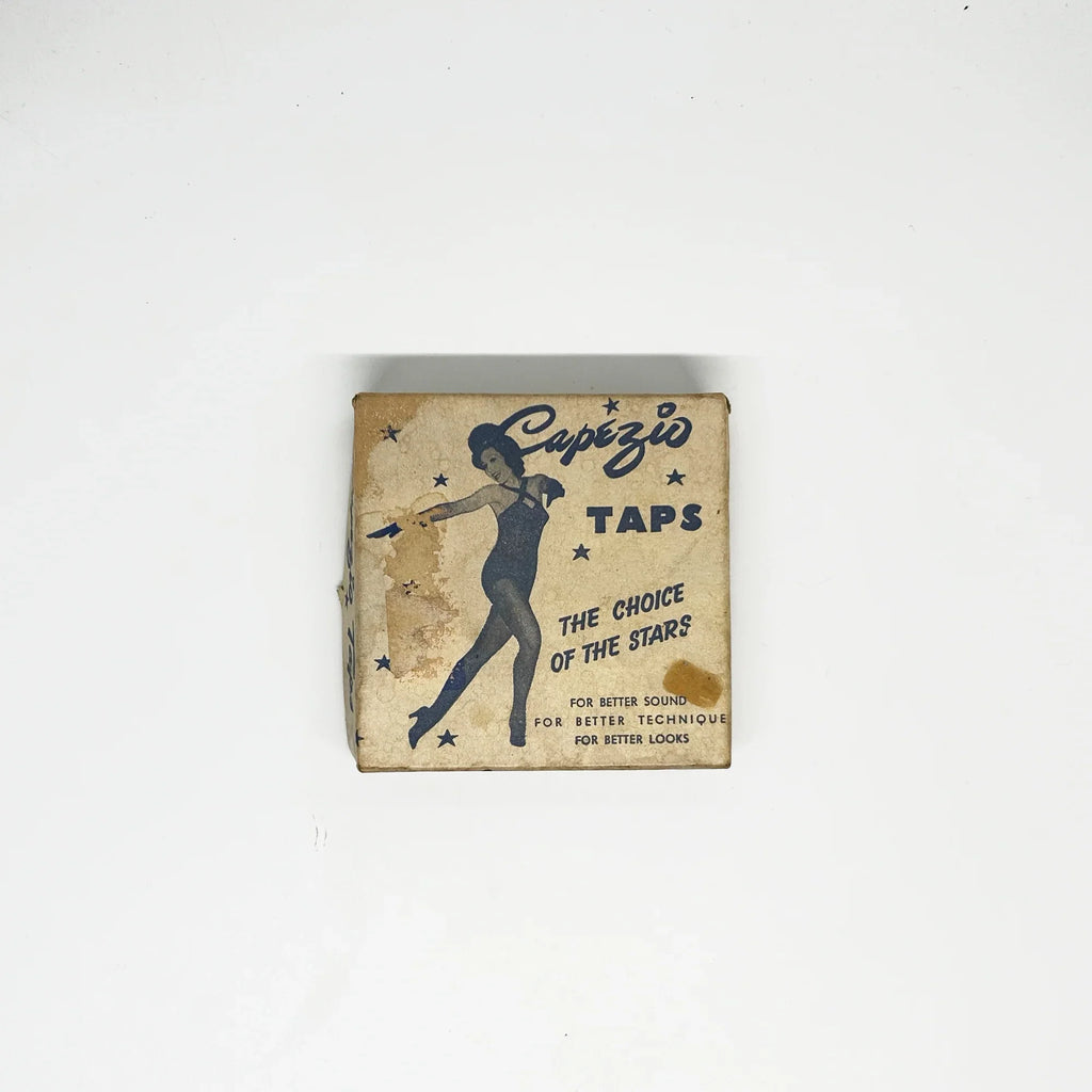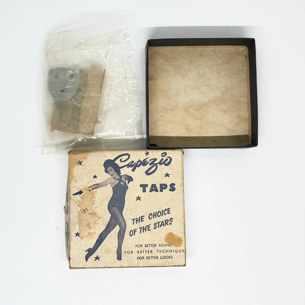 The square box measures 3.25: wide by 3.25" tall. The front shows a photo of a spirited female tap dancer. Inside the box, there are two taps, each engraved Capezio, and a small packet containing the nails or grips. They were used on Capezio character shoes and K360 oxfords. Made of aluminum. The box itself has seen some sights, and probably spent some time in a suitcase as its owner traveled about.