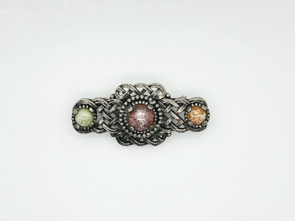 Embellish your style with the elegant and enduring Vintage Celtic Knot Style Brooch Art Glass. This beautifully crafted brooch features textured metal encasing stunning round stones in shades of pale green, red, and gold-amber. Measuring at 1.75", this accessory will add a touch of sophistication to any ensemble. Perfect for those seeking a refined and timeless addition to their collection.