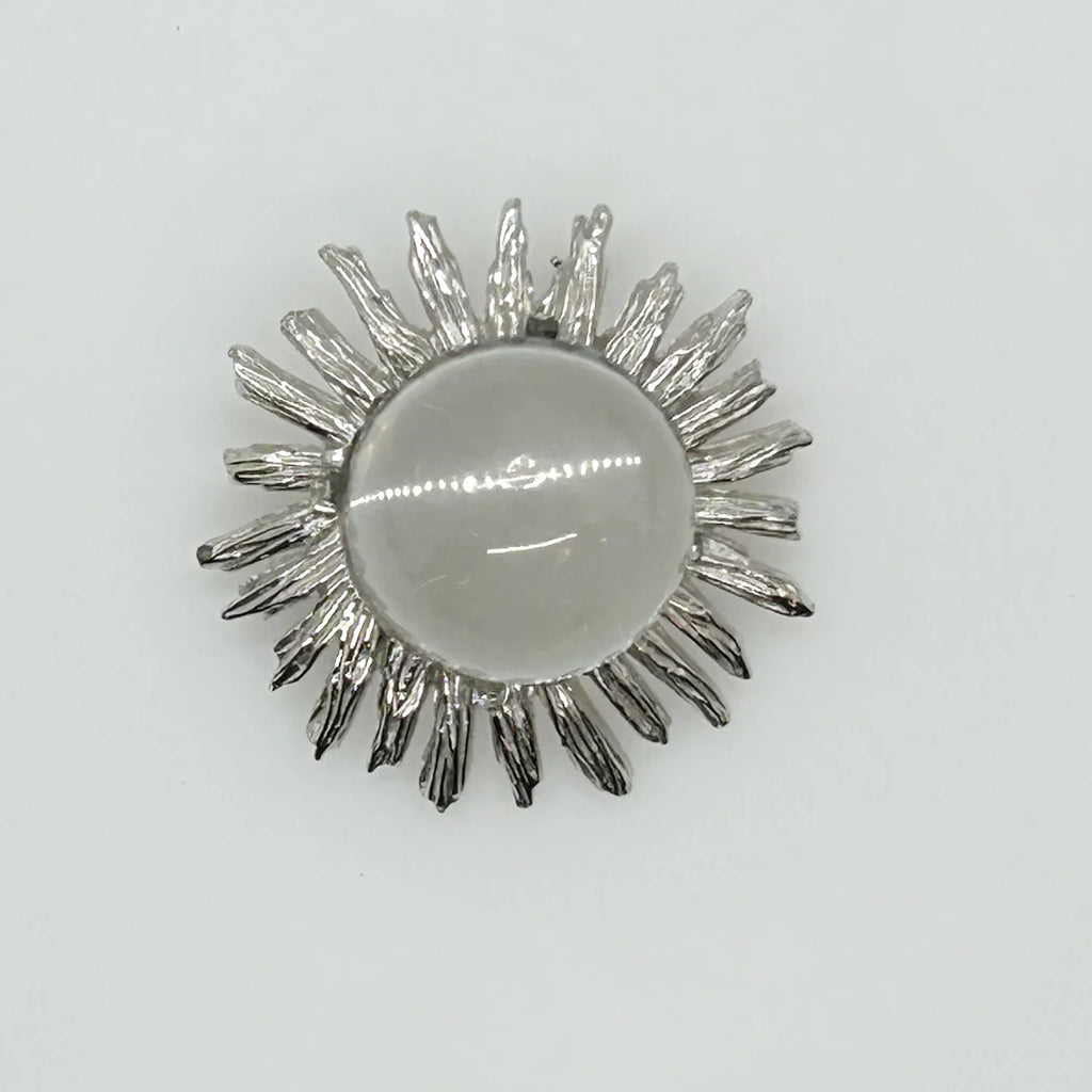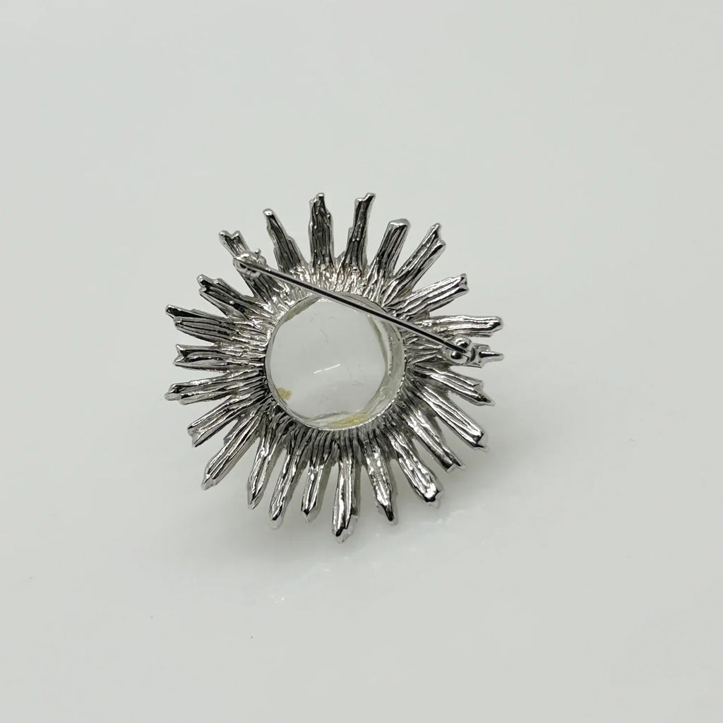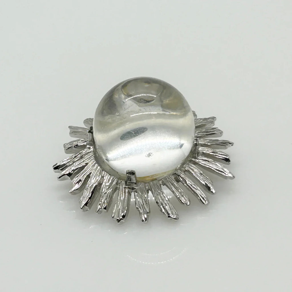 Introducing the Clear Bubble Brooch that transforms your accessory collection with timeless charm and artistic flair. This accessory promises to be the unique finishing touch your outfits have been missing. The smooth, clear glass sphere certainly serves as a captivating focal point. It is surrounded by a striking, textured silver tone frame which gives the brooch an abstract sunburst appearance. This piece represents one of the best choices among vintage brooches available today.