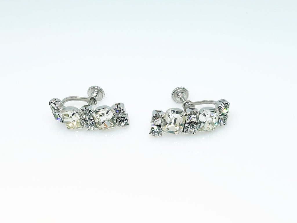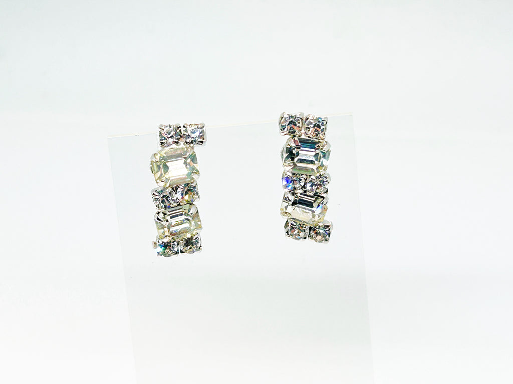 These bright, glittering, and relatively understated vintage earrings are versatile enough for any occasion. They're especially enchanting for evenings or special events. The earrings feature a unique stacked, half-hoop design. Emerald-cut stones elegantly alternate with two small, round stones, creating a captivating contrast. Measuring approximately 1" in length and boasting a subtle curve, these earrings offer a distinctive touch. Secure screw-back closures and prong settings ensure a comfortable and safe fit, allowing you to flaunt your glamorous style with confidence.